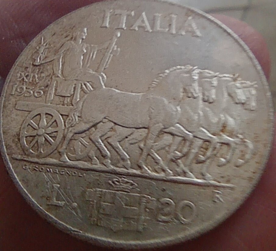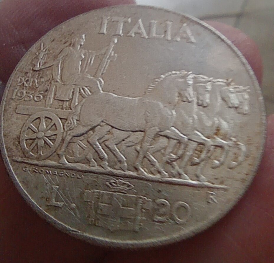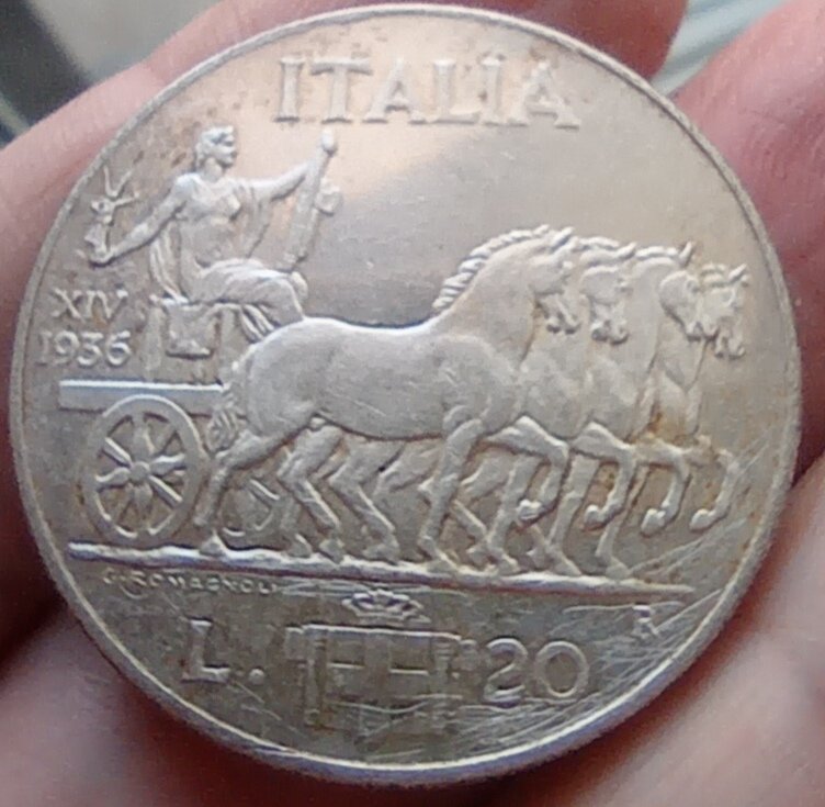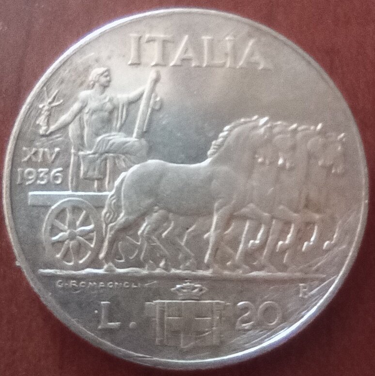 20 lire impero 1936 di 20 grammi e 35,5 mm.