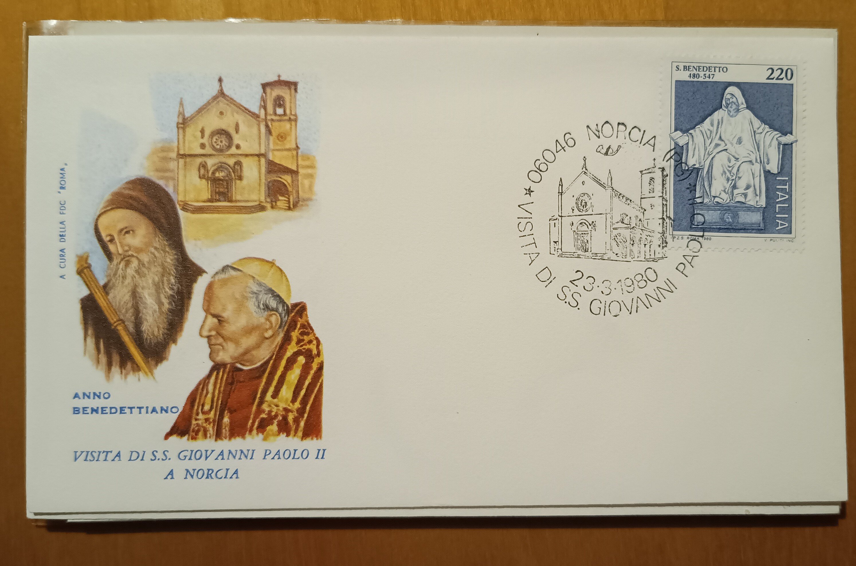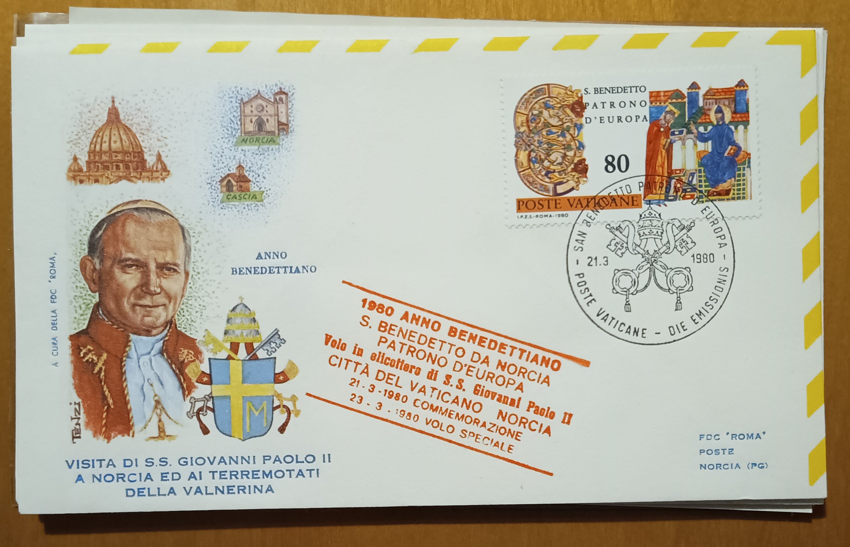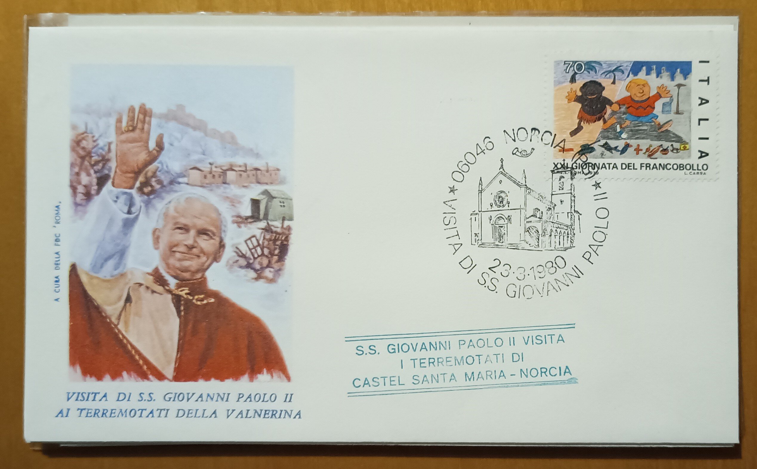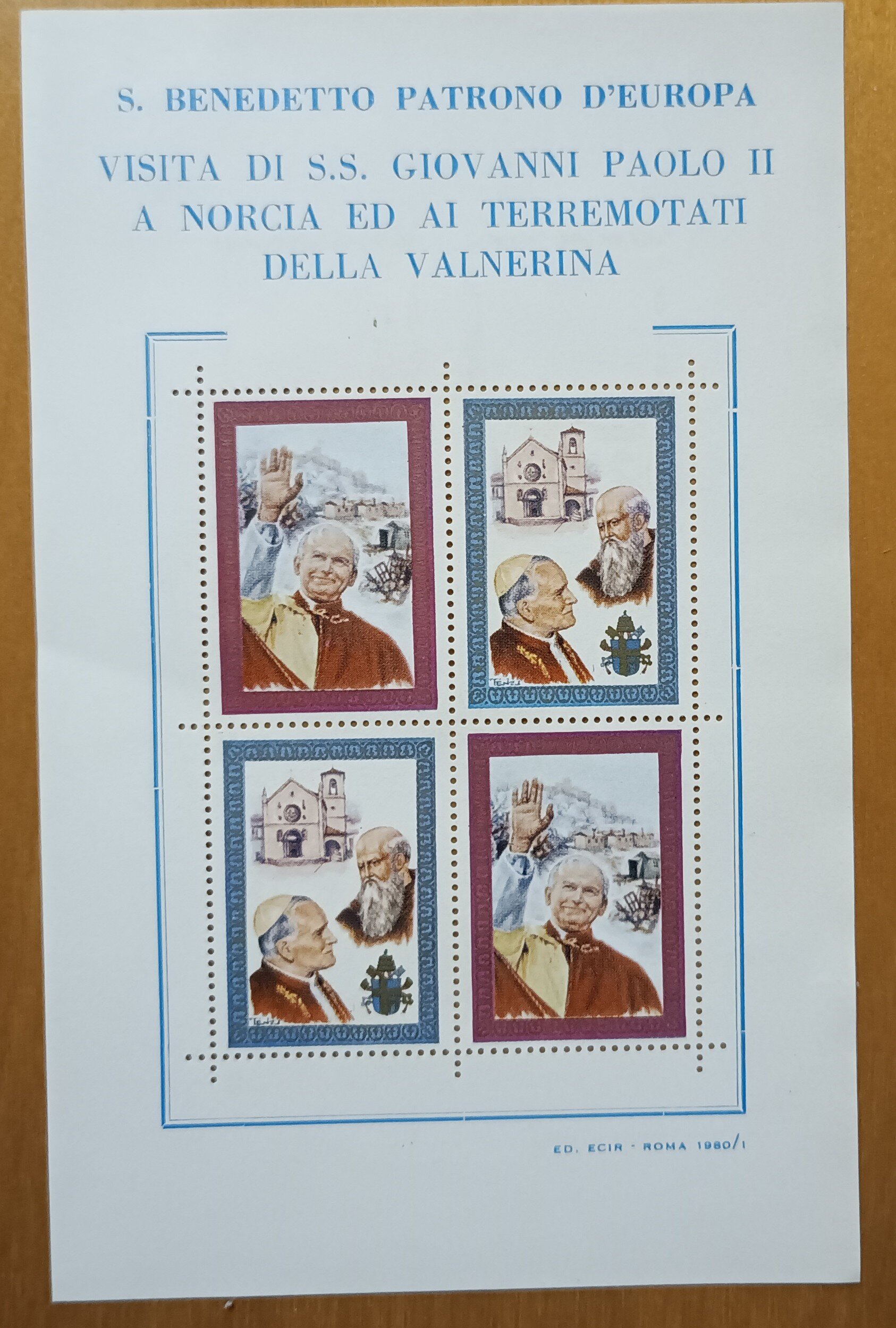 marco1972 Inviato 4 ore fa #1 Inviato 4 ore fa Come già accennato in un'altra discussione, uno zio di mio papà molto religioso ha raccolto un po' di buste commemerative di alcuni viaggi papali. Ora che è mancato questo materiale è arrivato a me (sia come ricordo, sia perché sono l'unico che lo apprezza veramente). Partiamo con il viaggio di Giovanni Paolo II del marzo 1980 a Norcia ed ai terremotati della Valberina. E un foglietto erinnofilo