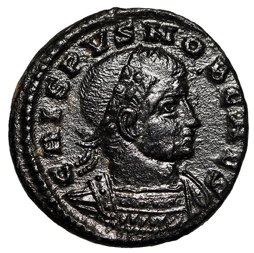 DRITTO: CRISPVS NOB CAES Bust of Crispus, laureate, cuirassed, right
