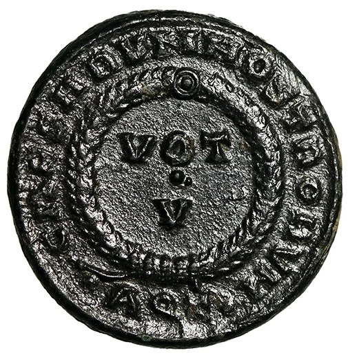 VERSO: CAESARVM NOSTRORVM VOT/V within a laurel wreath;