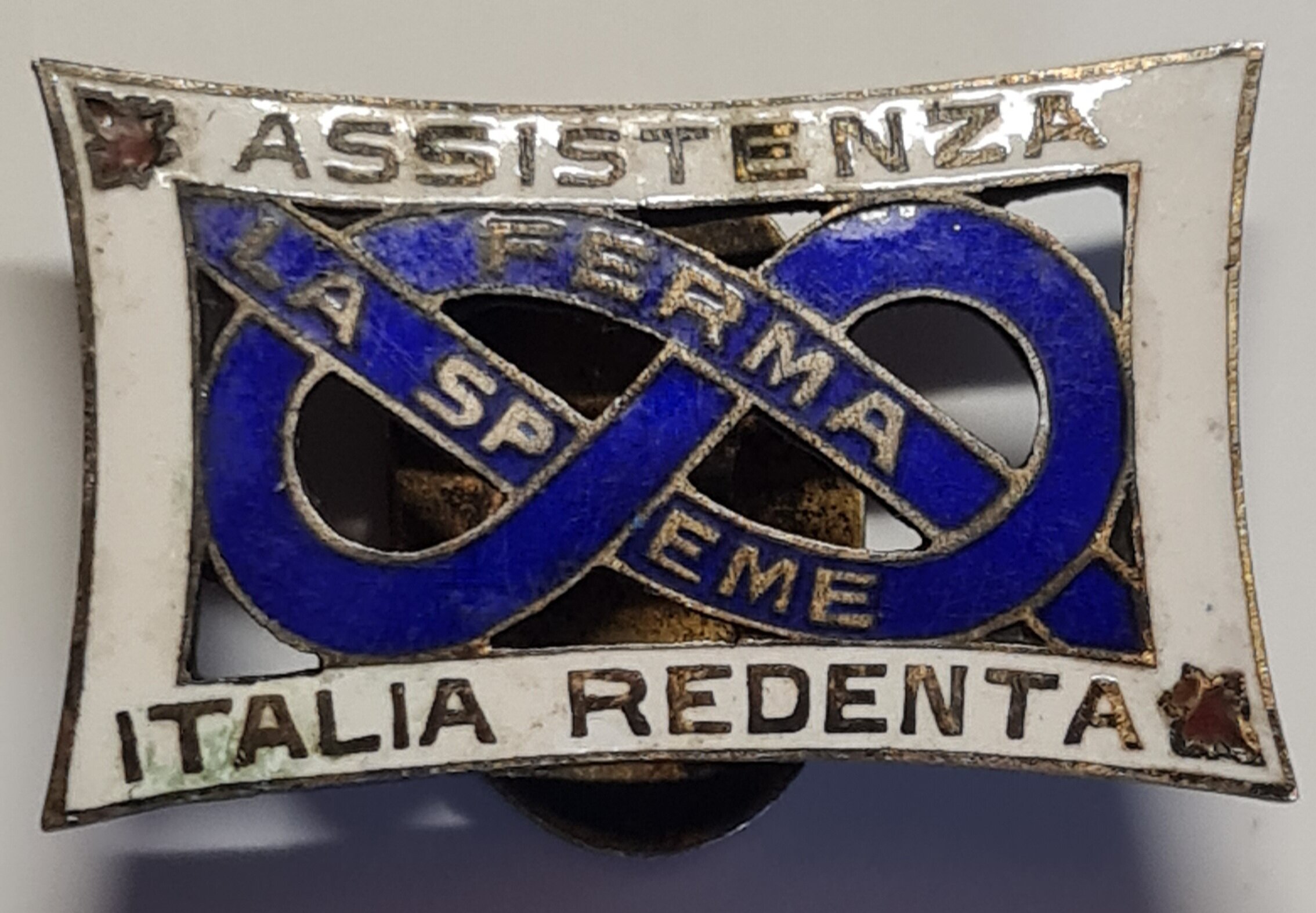 Rivolgo agli esperti del settore richiesta di collaborazione per meglio individuare la spilletta da colletto della Associazione Italia Redenta, che porta inciso sul nastro azzurro annodato il motto "FERMA LA SPEME". La spilla di forma pressoche' rettangolare mm. 32 x 20 ca. e peso di gr. 7,30 con smalti bianchi ed azzurri non presenta indicazioni del produttore.