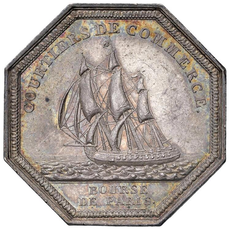 Sur une banderole: COURTIER DE COMMERCE. Un vaisseau naviguant à pleines voiles. Exergue: BOURSE DE PARIS. Jeton octogone, 34 mm