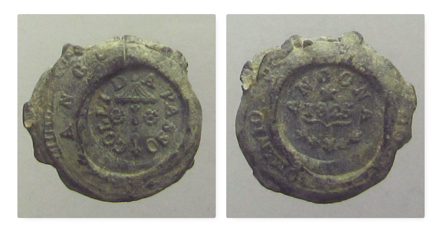 L'altro lato presenta la "Basilica" (l'ombrellino) con le chiavi decussate. Si, venivano usate in occasione delle Sedi . Ma si trovano sistematicamente anche nei sigilli doganali dello Stato Pontificio. Ve ne presento due della Dogana di Ancona, ma come potete vedere siamo molto più vicini a noi, inizio '800. Altro non so dirvi non essendo un conoscitore di piombi doganali. Ho guardato anche il Serafini, ma non ho trovato pezzi simili tra le bolle.  image.thumb.jpeg.2f210ac78dd747b13722d1a76c24d5e7.jpegimage.thumb.jpeg.cf009f31b6cfc74e7e987d5be4fbdc23.jpeg
