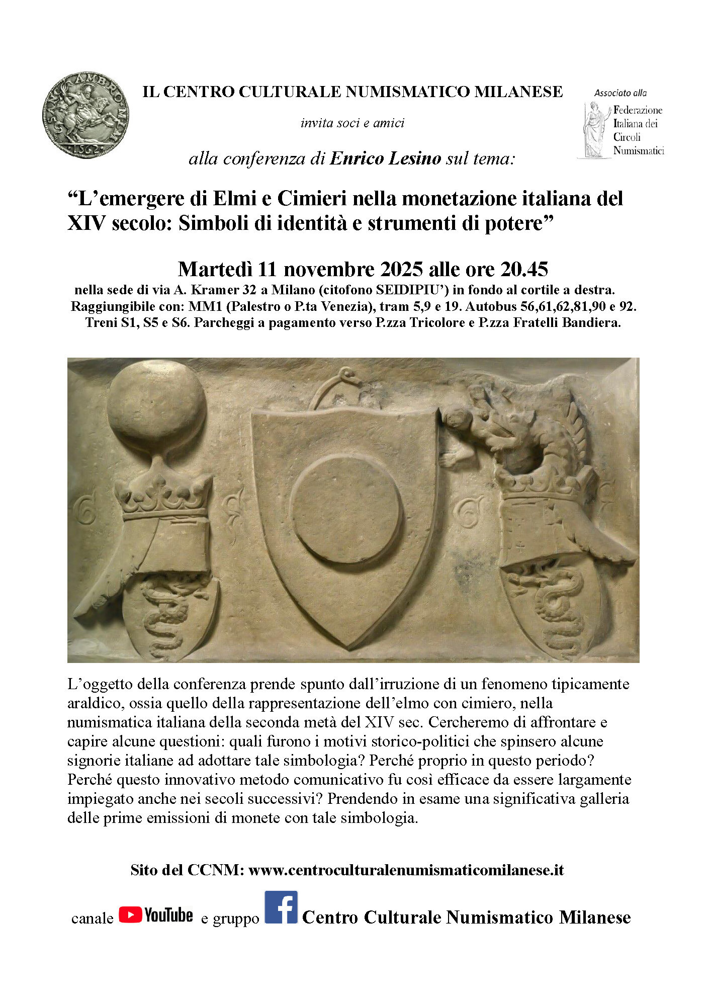 Martedì 11/11/2025 alle ore 20:45 - Al CCNM Milano: Conferenza di Enrico Lesino "L'emergere di Elmi e Cimieri nella monetazione italiana del XIV secolo: Simboli di idendità e strumento di potere"