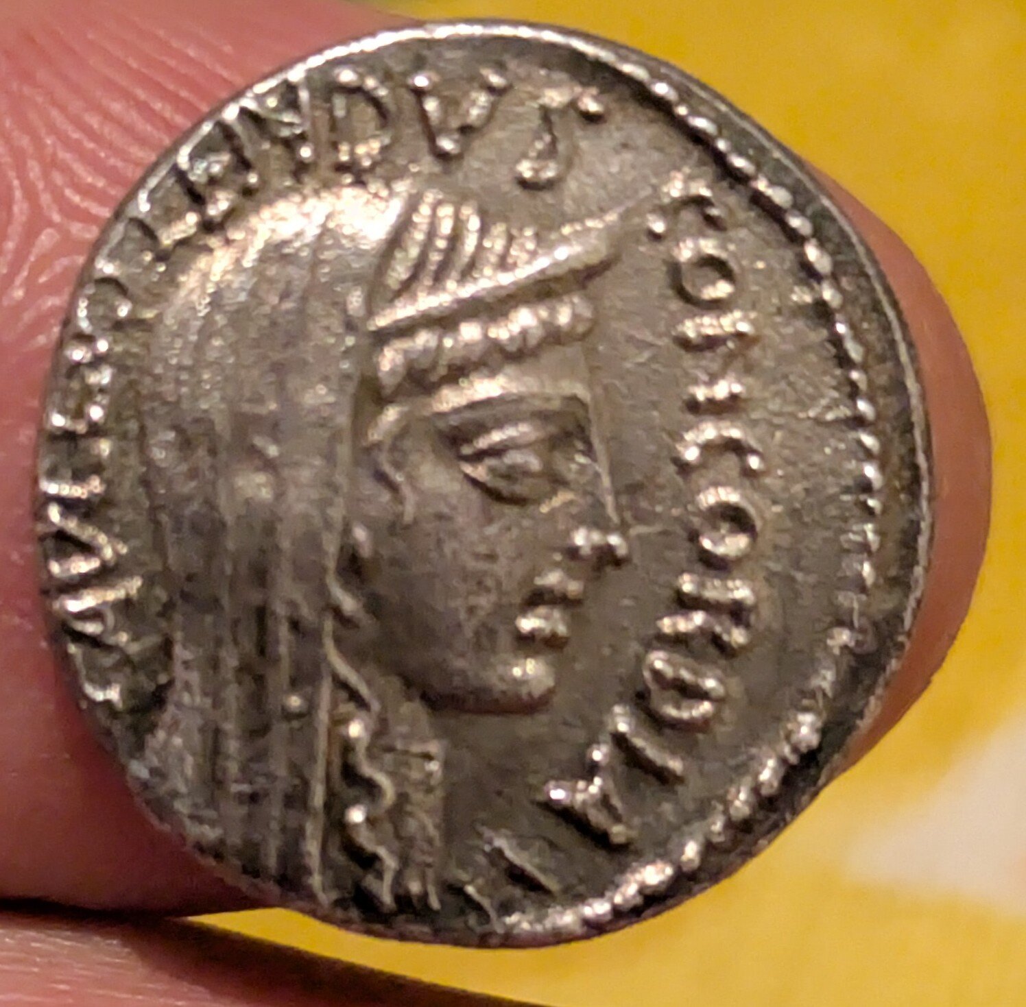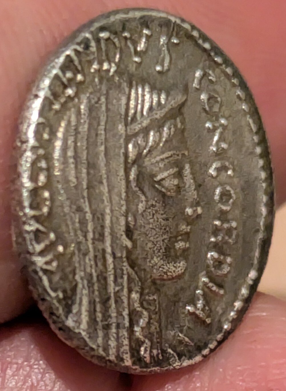 Ripropongo di nuovo questo denario perché era stata dichiarato falso qui sul forum, ed anche in qualche negozio ma al London Coin Fair che si è tenuto oggi, mi hanno garantito che la moneta è autentica. Ben 3 persone mi hanno detto che è autentica, e una su tutte è un certo Andrew Barratt che è un numismatico di professione da oltre 40 anni (non l'ultimo arrivato!), curatore e referente per le monete antiche. Lui pulisce e restaura monete per privati e per musei. Mi ha spiegato che la moneta è stata pulita con acido e che i difetti al dritto, i vari segni nel campo, confermano l'autenticità. Mi ha anche spiegato il dettaglio delle varie lettere, fatte con punti attaccati e gli angoli molto netti, segno che la moneta non ha circolato molto. Mi ha anche detto perché la maggior parte delle persone direbbe che è falsa.