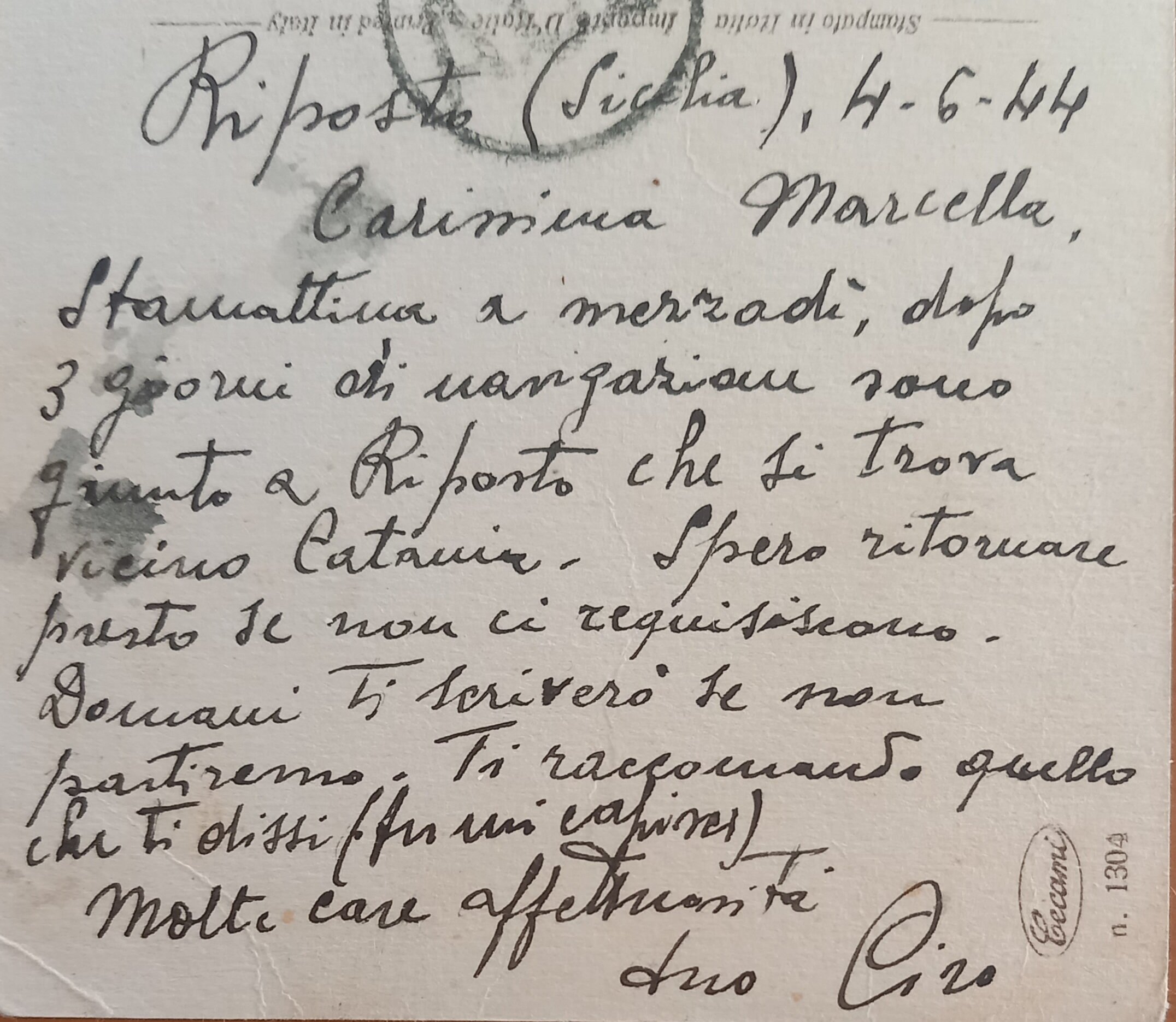 dareios it Inviato 7 ore fa Supporter #1 Inviato 7 ore fa Riposto (Sicilia) 4-6-44 Carissima Marcella Stamattina a mezzodì, dopo 3 giorni di navigazione sono giunto a Riposto che si trova vicino Catania. Spero ritornare presto se non ci requisiscono. Domani ti scriverò se non partiremo. Ti raccomando quello che ti dissi (tu mi capisci). Molte care affettuosita'. Tuo Ciro Ciro non sa che mentre sta scrivendo a Marcella, si sta compiendo una giornata storica: La liberazione di Roma da parte degli alleati. 3