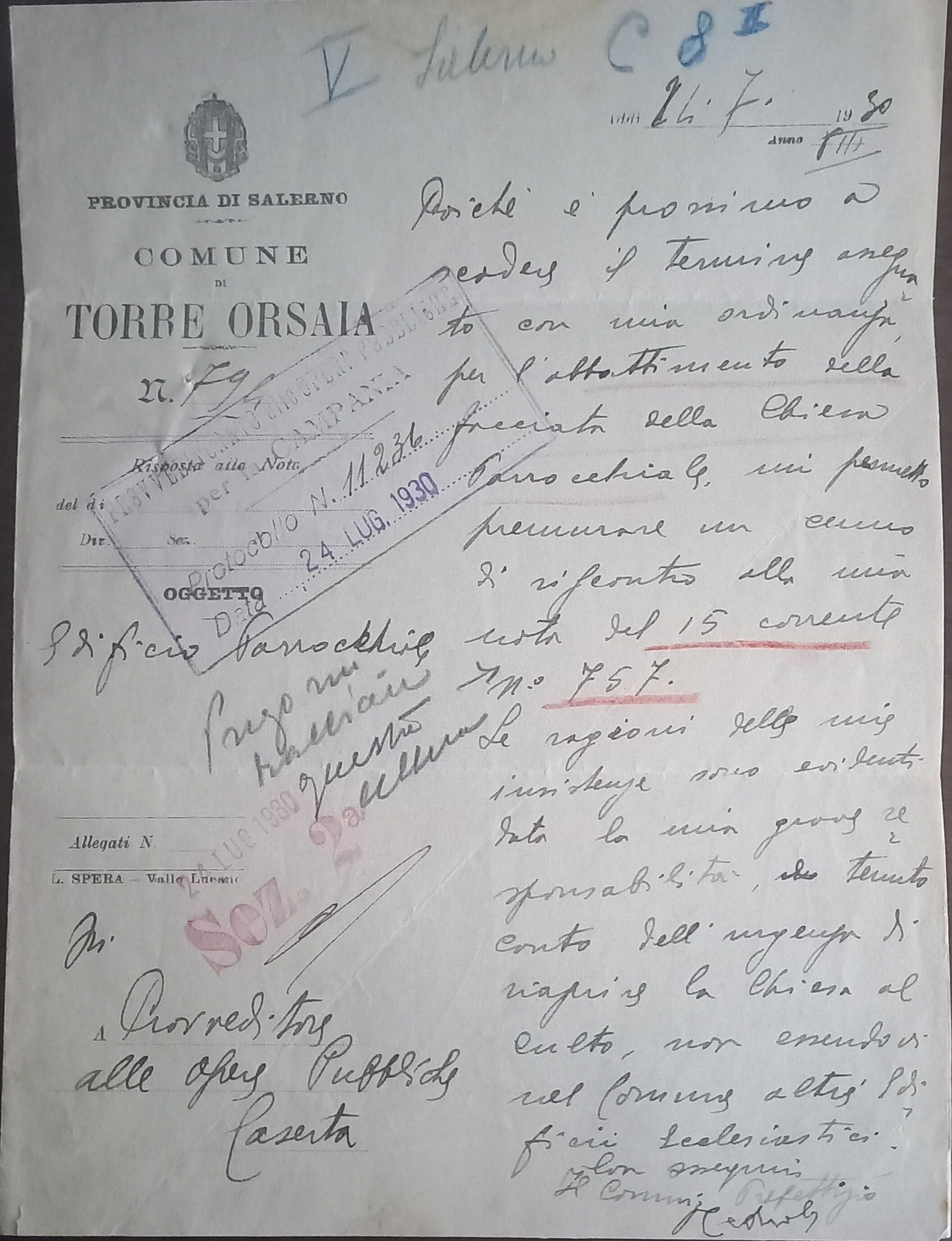 dareios it Inviato 3 ore fa Supporter #1 Inviato 3 ore fa Questa lettera contiene un'ordinanza per l'abbattimento della facciata della Chiesa parrocchiale del comune di Torre Orsaia in provincia di Salerno, da parte del Commissario Prefettizio del paese, indirizzata al Provveditore delle opere pubbliche della Campania. La mia domanda è questa, come va inquadrata questa lettera nel collezionismo postale? Grazie e buona serata. 2