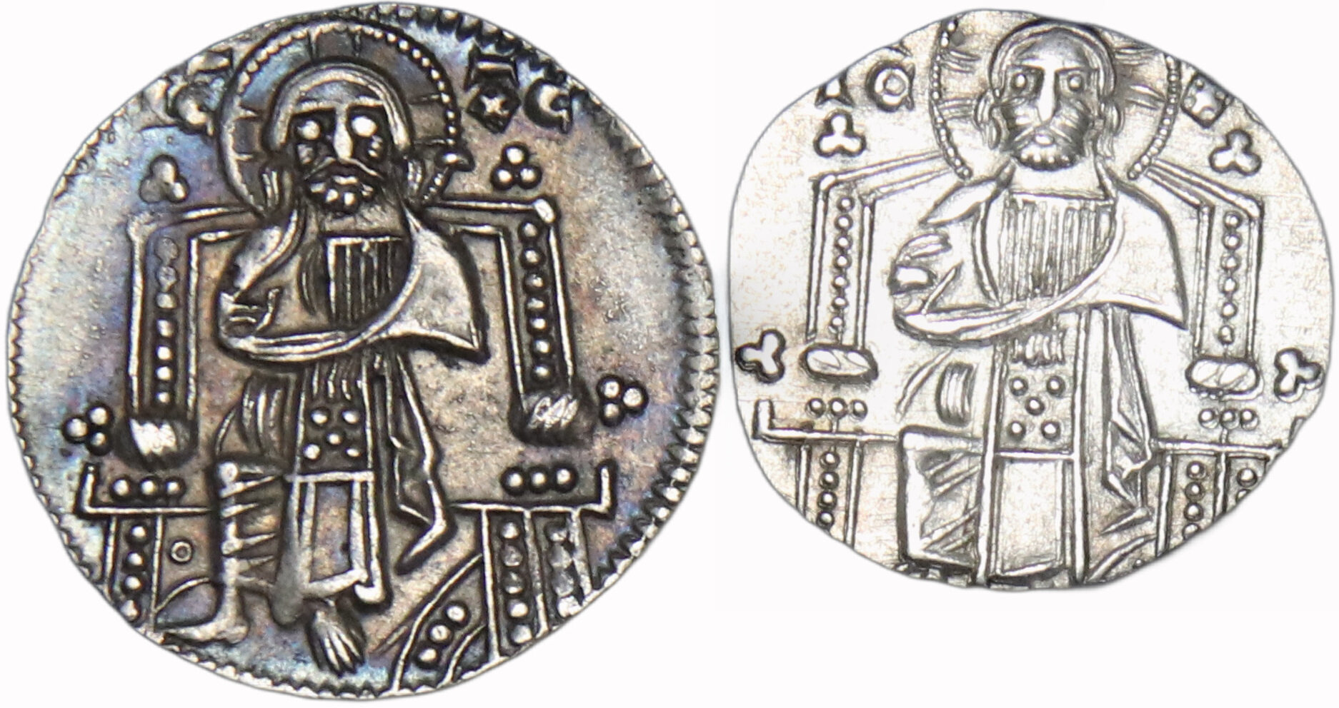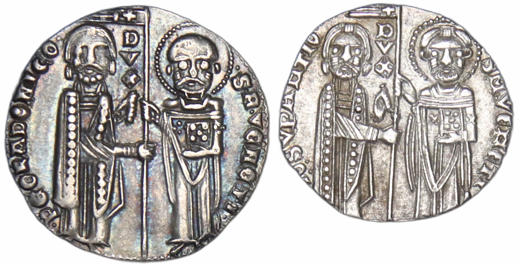 Ho recentemente acquistato in un’asta il grosso matapan a destra della foto (Giovanni Soranzo, credo). Sul sito non era specificato né il peso né il diametro. Appena l’ho avuto in mano, però, sono rimasto impressionato dalle dimensioni, è minuscolo. L’ho fotografato accanto a un altro grosso che ho in collezione e le proporzioni sono ben evidenti. Non che mi aspettassi tanto, visto il basso prezzo di aggiudicazione e le mancanze ai bordi (tosato?)  ma, così sospetto sia un falso sfuggito al curatore dell’asta. Mi sembra molto improbabile una variante più piccola. Il Diametro è 18 mm, il peso 1,58 g.