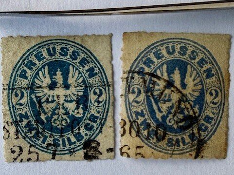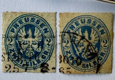 Alan Sinclair Inviato 2 ore fa Supporter #1 Inviato 2 ore fa Buon Pomeriggio a Tutti, mi sono accorto che non avevo nemmeno un esemplare antiquario tedesco in collezione e così ho acquistato i due esemplari che oggi condivido. Si tratta di 2 francobolli da 2 silb. gr. ( ?? ) del 1861, antico stato tedesco di Prussia. Entrambi gli esemplari sono annullati, del tipo perforato a trattini, stemma con aquila. Veniamo al colore, perché proprio due francobolli uguali ? Li ho presi tutti e due per meglio capire e confrontare il colore, uno è il blu di Prussia e l'altro è l'oltremare, stando al mio Sassone del 1967 ( in bianco e nero ), il blu di Prussia sarebbe quello con maggiore valore rispetto a tutta la serie prussiana del 1861, emessa in diversi valori e colori. La differenza di colore seppur sottile, c'è e si nota. Allego alcune foto con più o meno luce, il blu di Prussia è quello più scuro tra i due. Grazie per l'attenzione. 2
