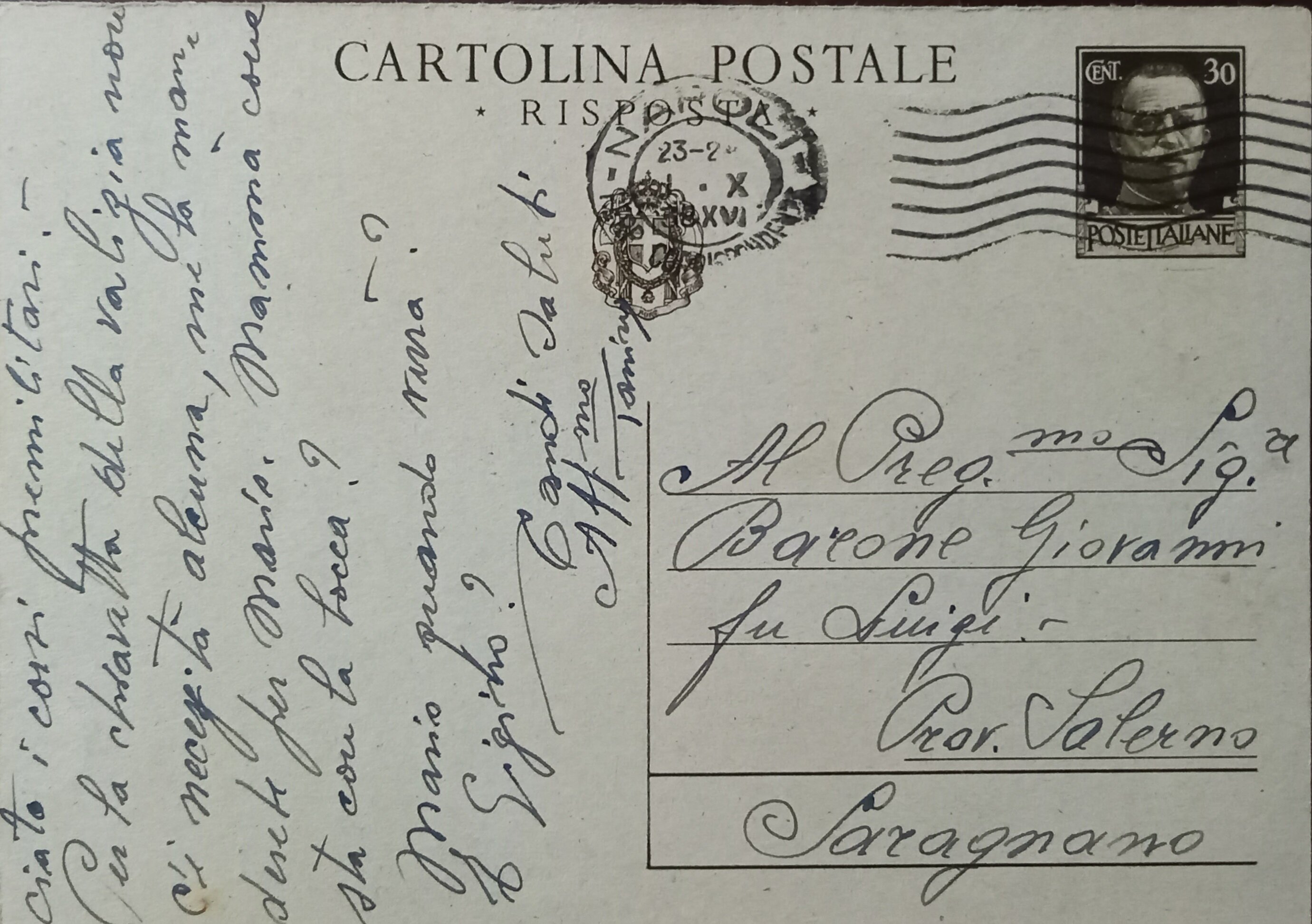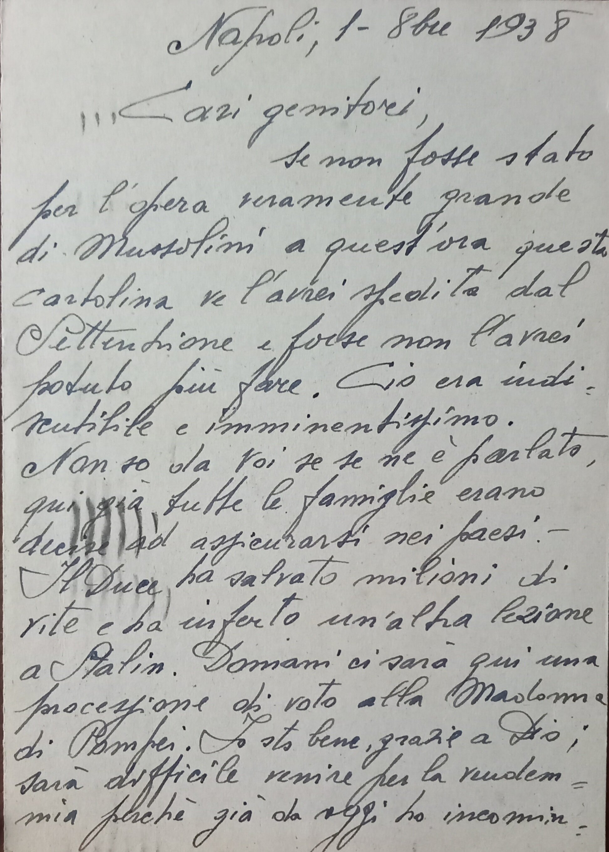 dareios it Inviato 1 ora fa Supporter #1 Inviato 1 ora fa Buona sera a tutti, questa cartolina postale partita da Napoli il primo ottobre 1938 per Saragnano (SA), contiene una serie di frasi che hanno a che fare con Mussolini. Solo che io non so a cosa si riferiscono e quindi in questo caso chiedo il vostro aiuto, più storico che postale. Per esempio, a che si riferisce il mittente quando scrive "se non fosse stato per l'opera grande di Mussolini"? E ancora, "qui già tutte le famiglie erano decise ad assicurarsi nei paesi" e ancora "il Duce ha salvato milioni di vite e ha inferto un'altra lezione a Stalin". Grazie per l'attenzione. 2