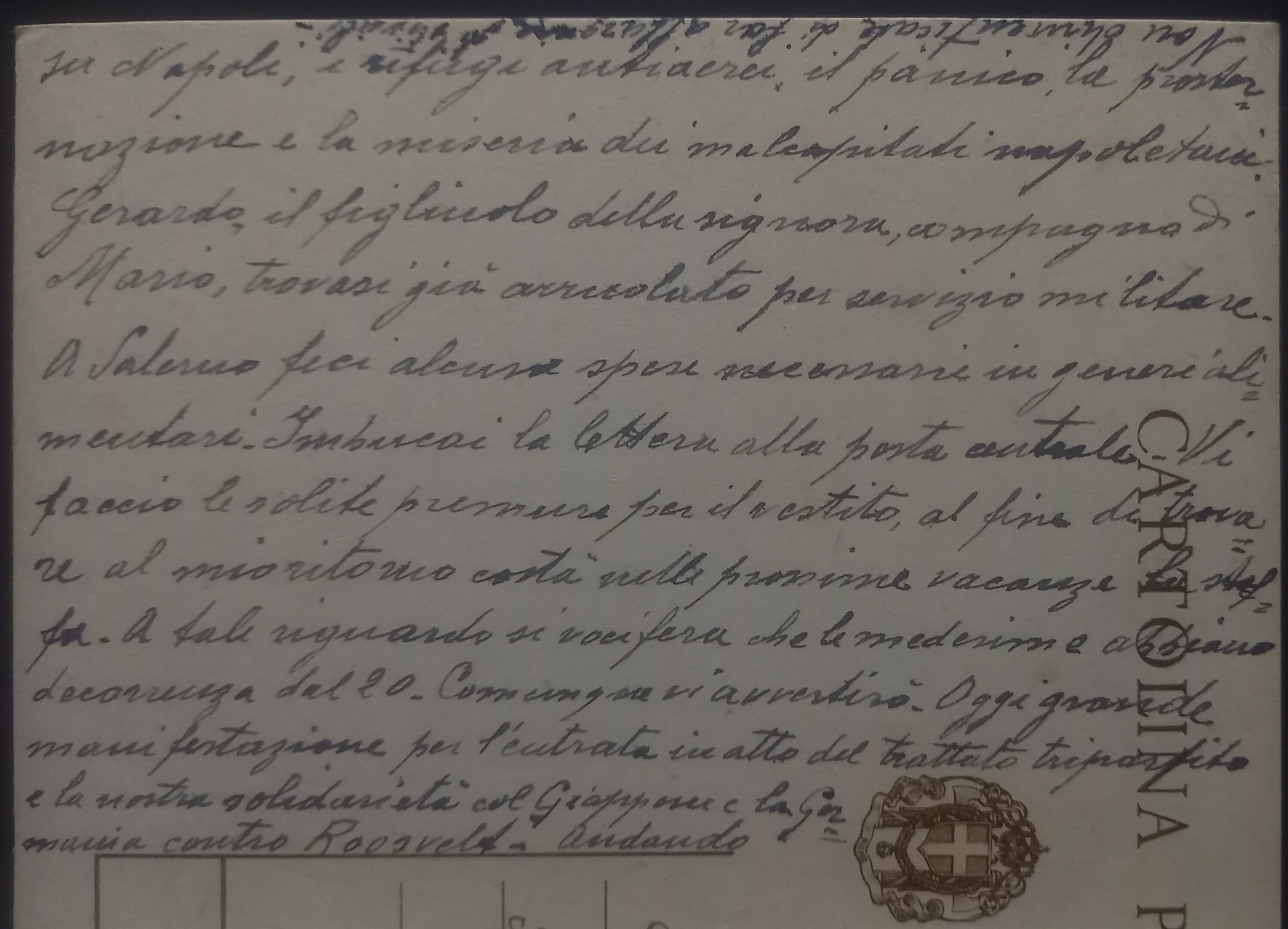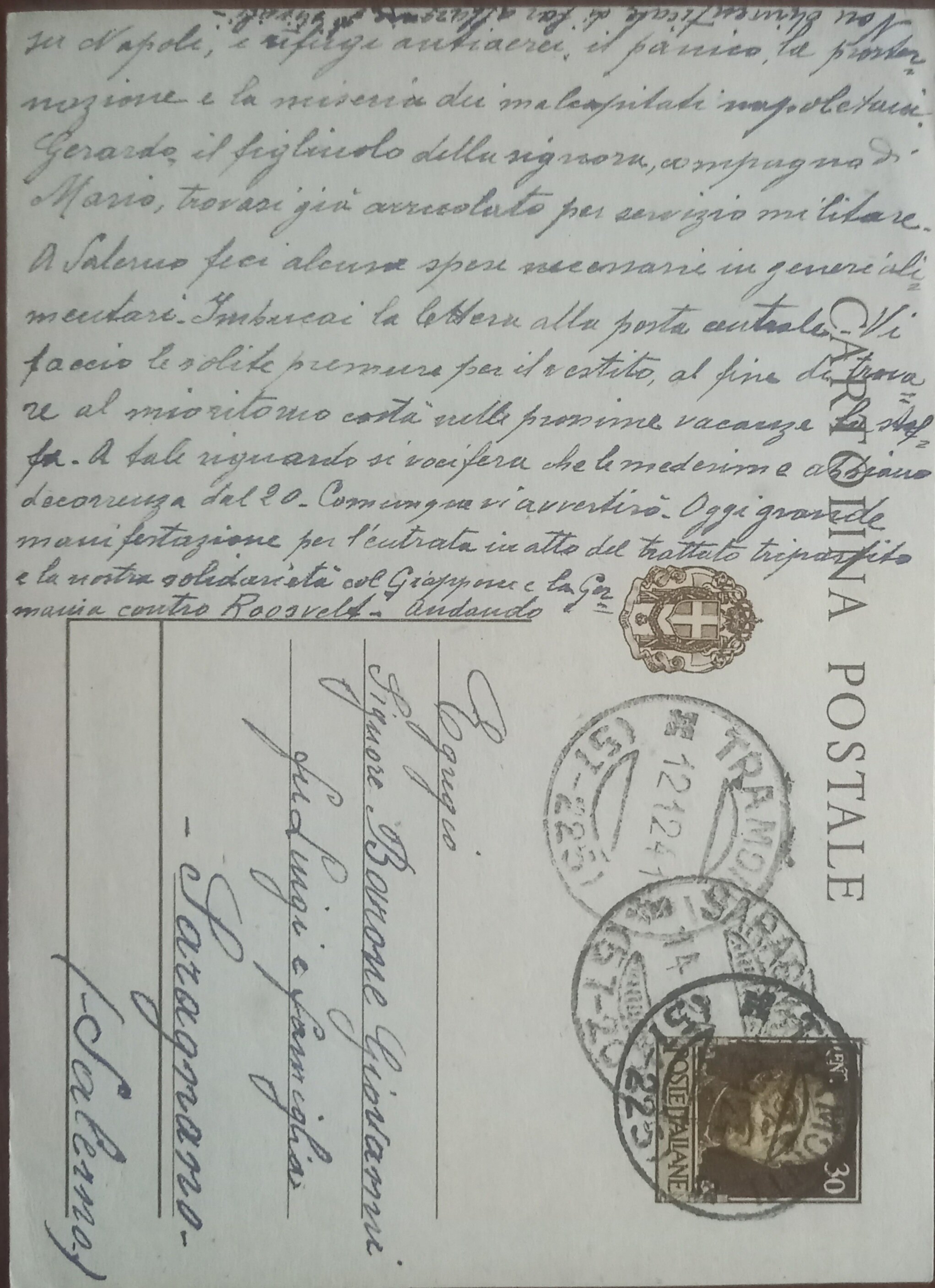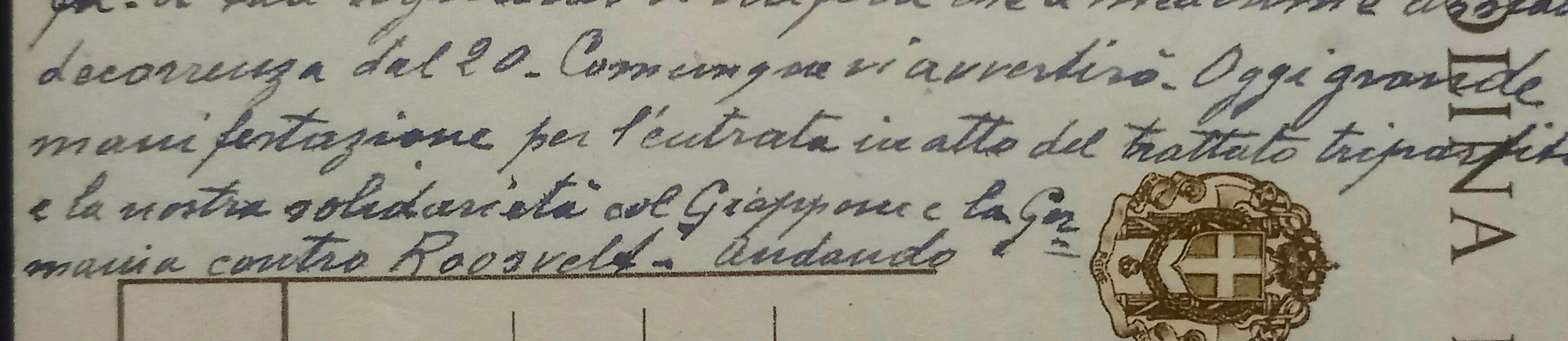 Buona sera, vi volevo mostrare questa cartolina postale datata 12 dicembre 1941 che secondo me mostra una incongruenza. Il mittente di nome Gigino scrive al padre Giovanni e alla fine della cartolina dice: "Oggi grande manifestazione per l'entrata in atto del trattato tripartito e la nostra solidarietà col Giappone e la Germania contro Roosevelt". Come è possibile visto che il trattato era stato firmato il 27 settembre del 1940 ? Che ne pensate?