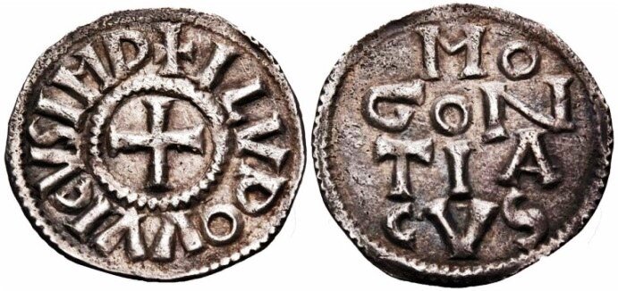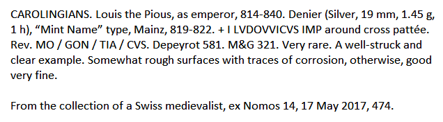 E' valutato " very rare " un notevole esemplare di denaro da Magonza al nome di Ludovico I il pio, nel tipo con al diritto croce contornata da leggenda ed al rovescio nome della zecca, qui su 4 linee .