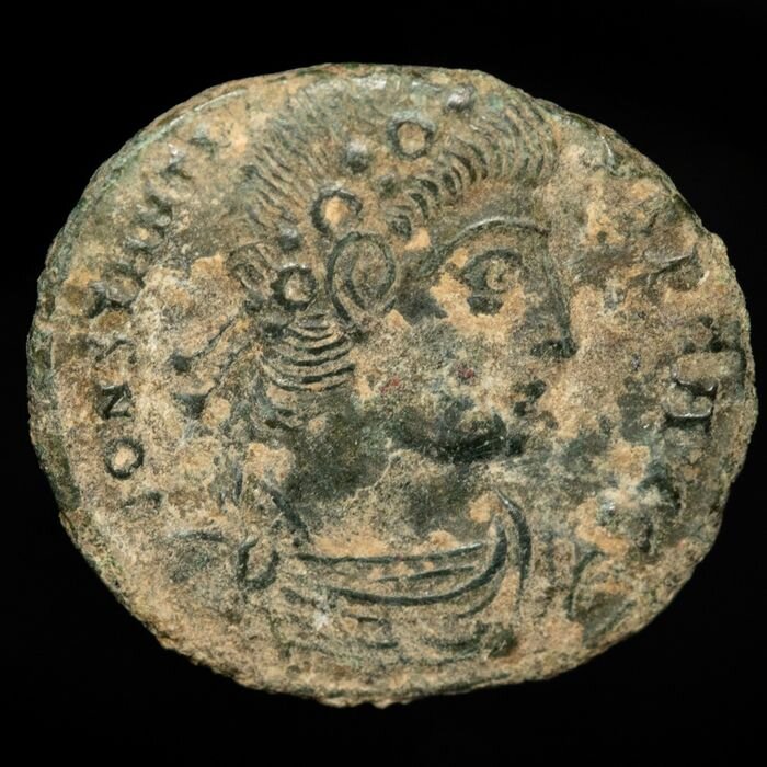 Busto di Costanzo II rivolto a destra, con diadema perlato (tipico delle emissioni tardo–costantiniane) e paludamentum sulla spalla.