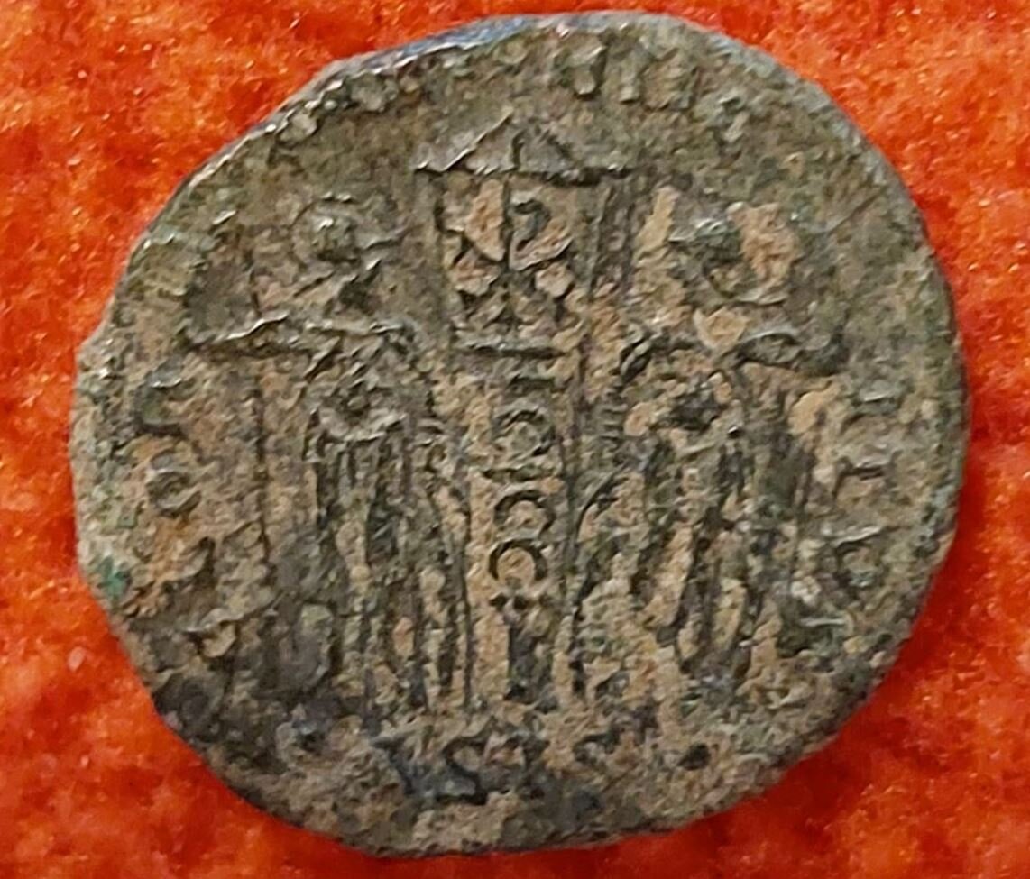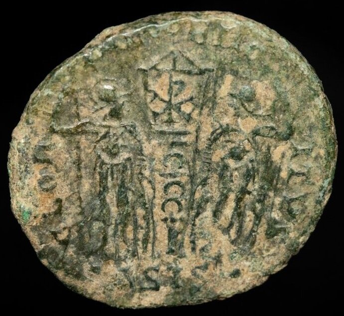 Due figure militari in piedi, con uno stendardo/asta centrale, con visibile un simbolo cristiano tipo Chi-Rho / labarum (il segno XP).