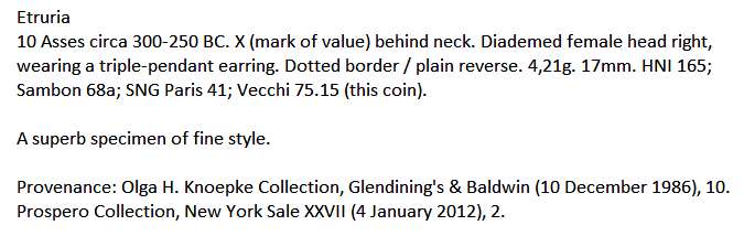 Indicato nella citata " Prospero collection " come moneta da Populonia, un esemplare da 10 assi con al diritto notevole testa femminile e rovescio liscio .