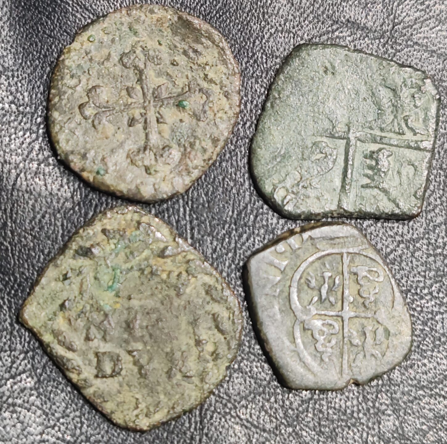 La moneta in alto a destra è classificata come Quattrino per Filippo IV 1621-1665 MIR p. 335 N° 376/2 peso 1,32 g diametro 13,5 mm circa