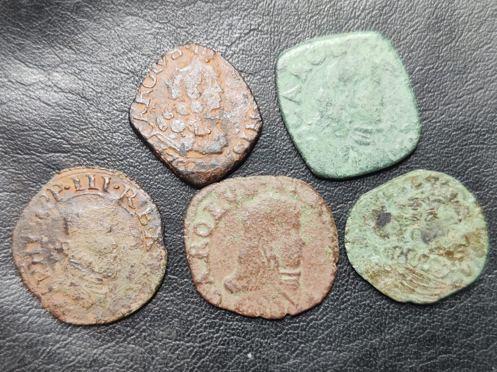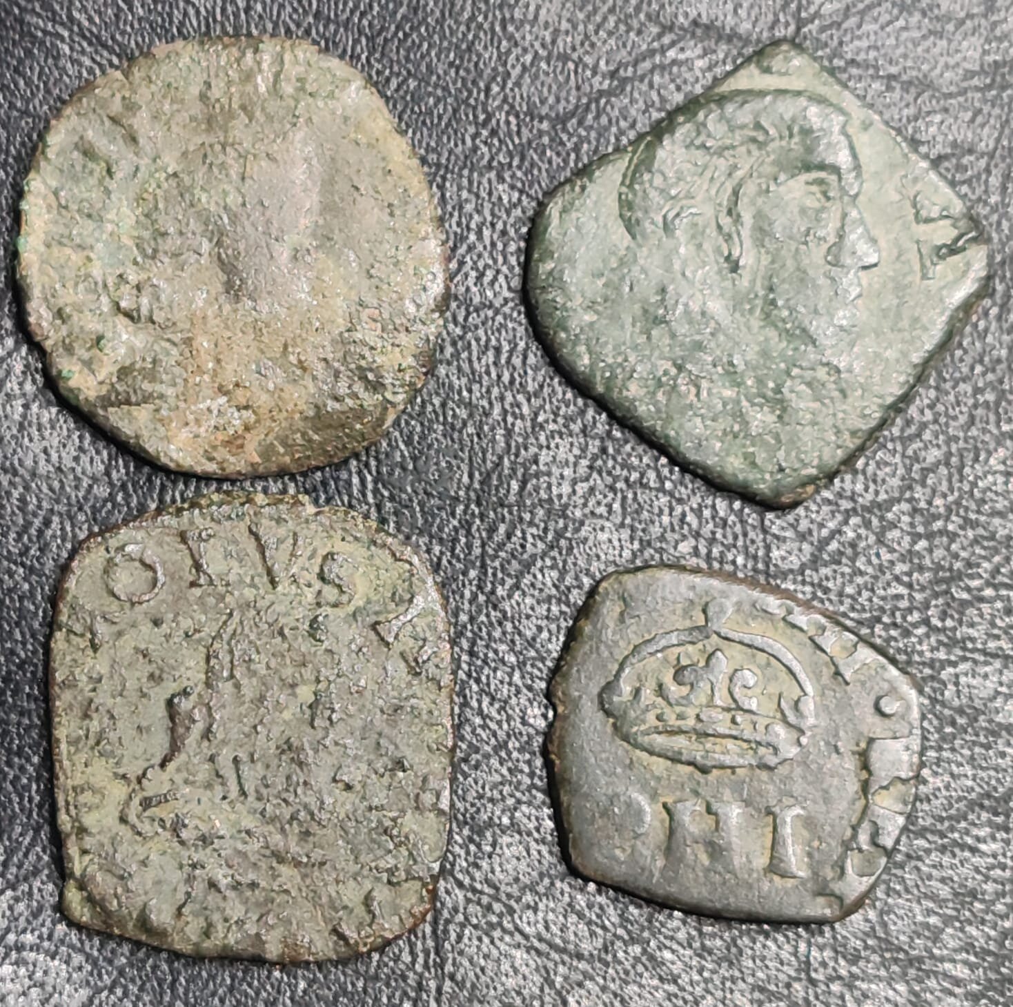 La moneta in basso a destra è classificata come Quattrino per Filippo IV 1621-1665 MIR p. 335 N° 376/2 peso 1,90 g diametro 15 mm circa