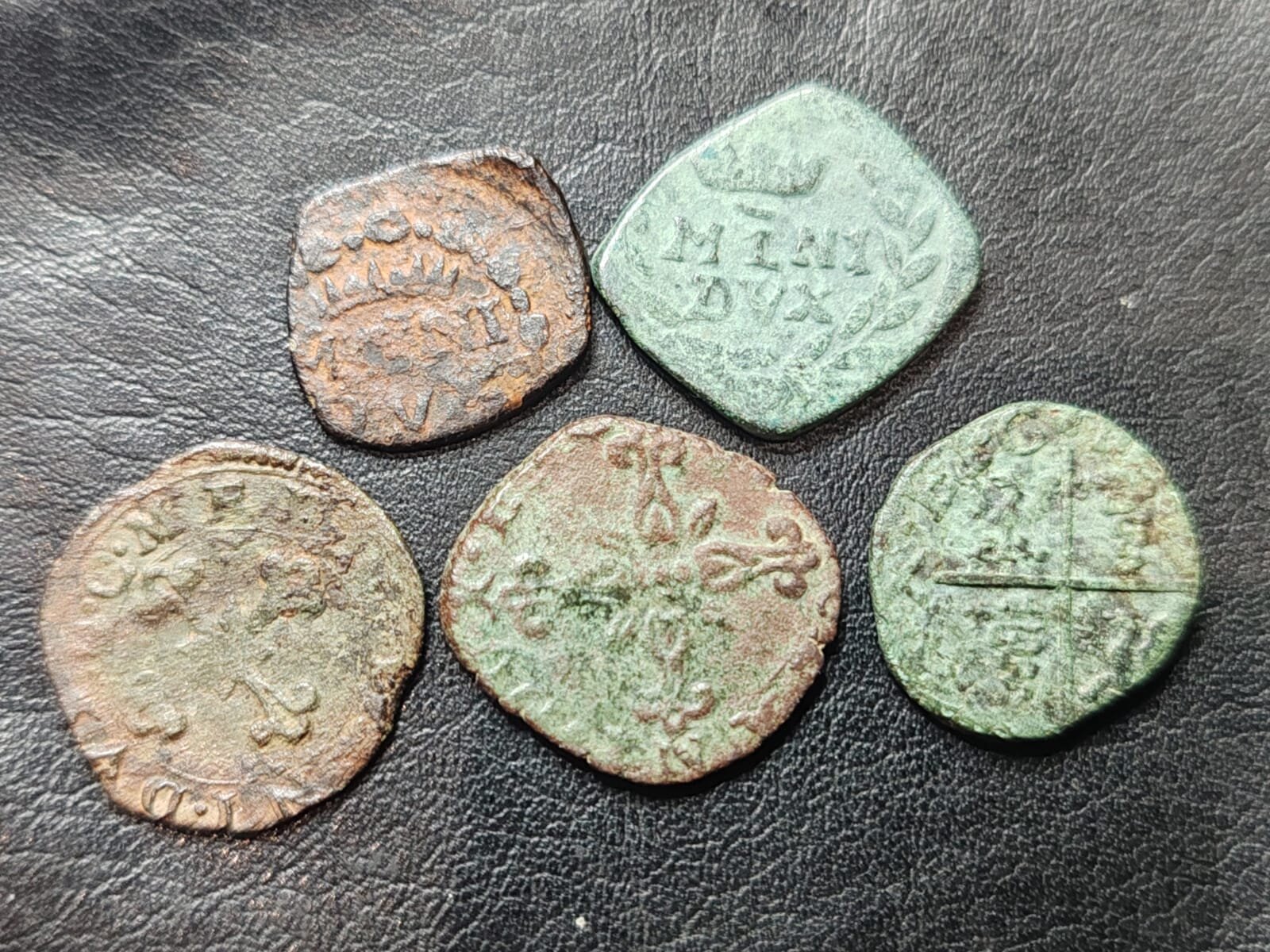 La moneta in basso al centro è classificata come Soldino per Carlo II 1665-1700 MIR p. 341 N° 385/1 RARO peso 1,73 g diametro 15,5-17-8 mm circa