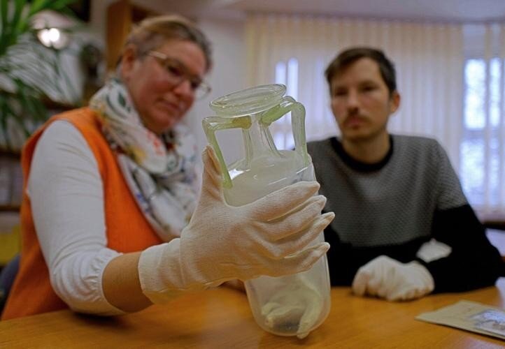 http://www.thehistoryblog.com/wp-content/uploads/2025/11/Archaeologists-examine-intact-glass-vessel-200x163.jpgThe lid was still fixed in place, clamped to the sarcophagus with iron brackets and molten lead. It must have been an intimidating prospect for looters, because the sarcophagus was never disturbed until the team of archaeologists from the Budapest History Museum and heavy machinery lifted the lid.