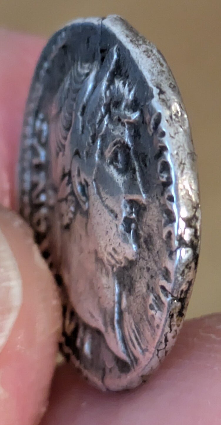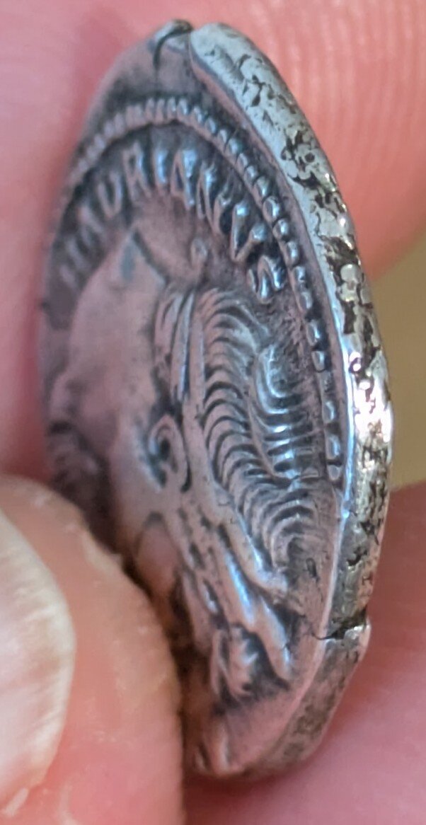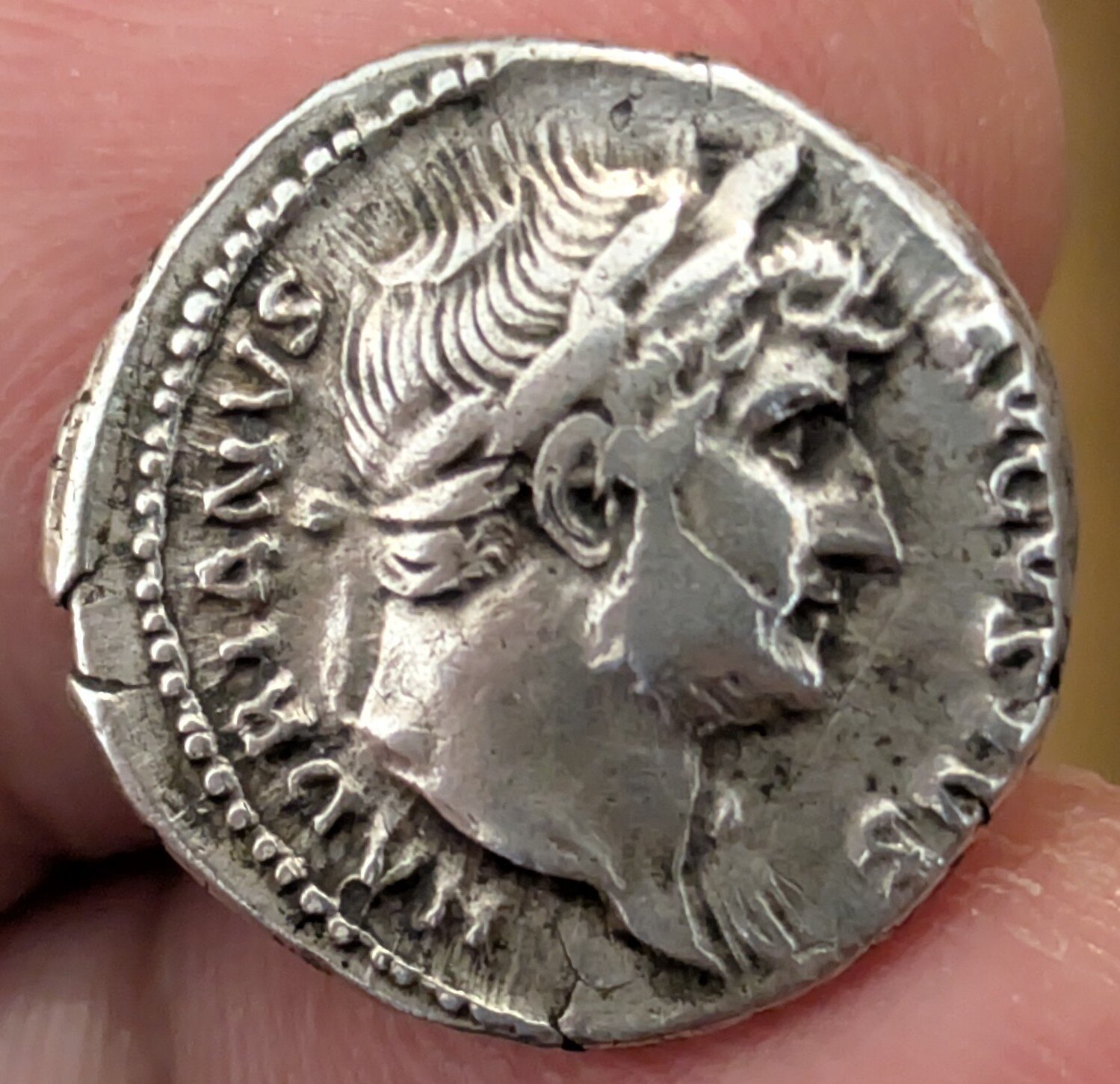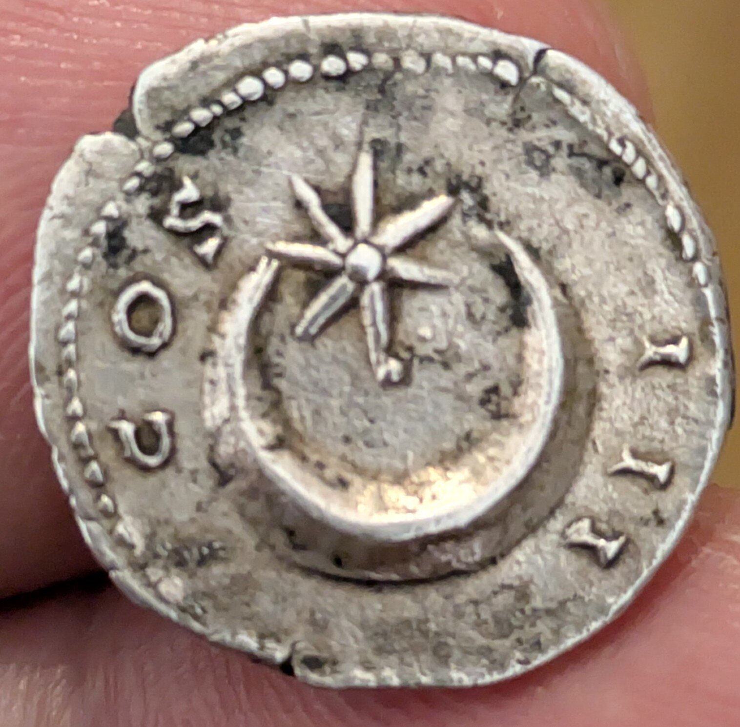 Un suggestivo denario di Adriano con al rovescio la luna crescente che "avvolge" una stella con sette punte. Al centro del rovescio ci sono inoltre due punti: uno ben evidente posizionato alla fine di una delle punte ed un altro più piccolo posizionato a nord est (ore 2) dello stesso, e non capisco se facciano parte del disegno o siano dovuti ad imperfezioni del conio. I rilievi dovevano essere molto pronunciati in quanto anche dopo evidente circolazione sono ancora alti sul piano, specie la luna.