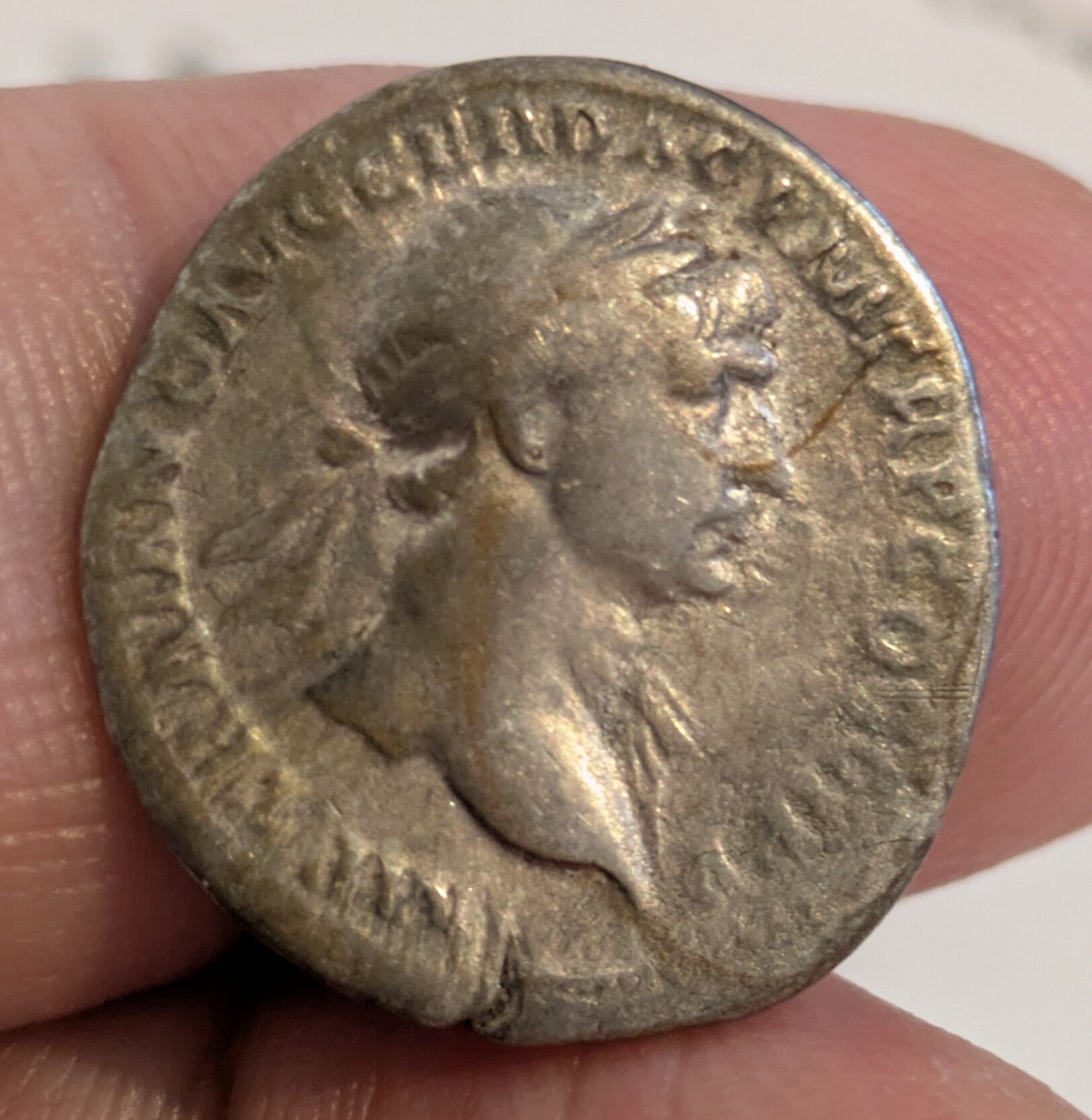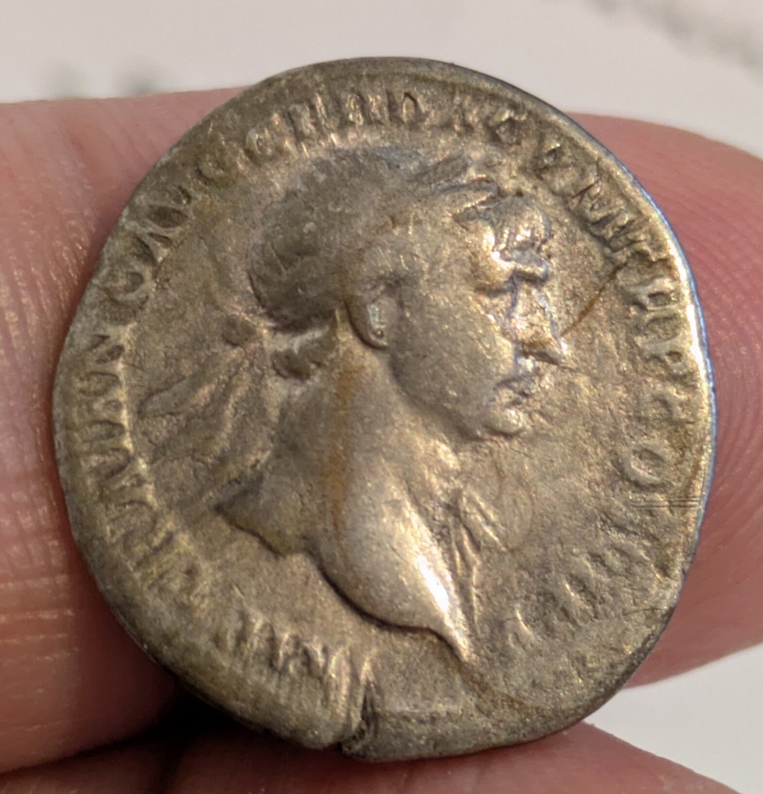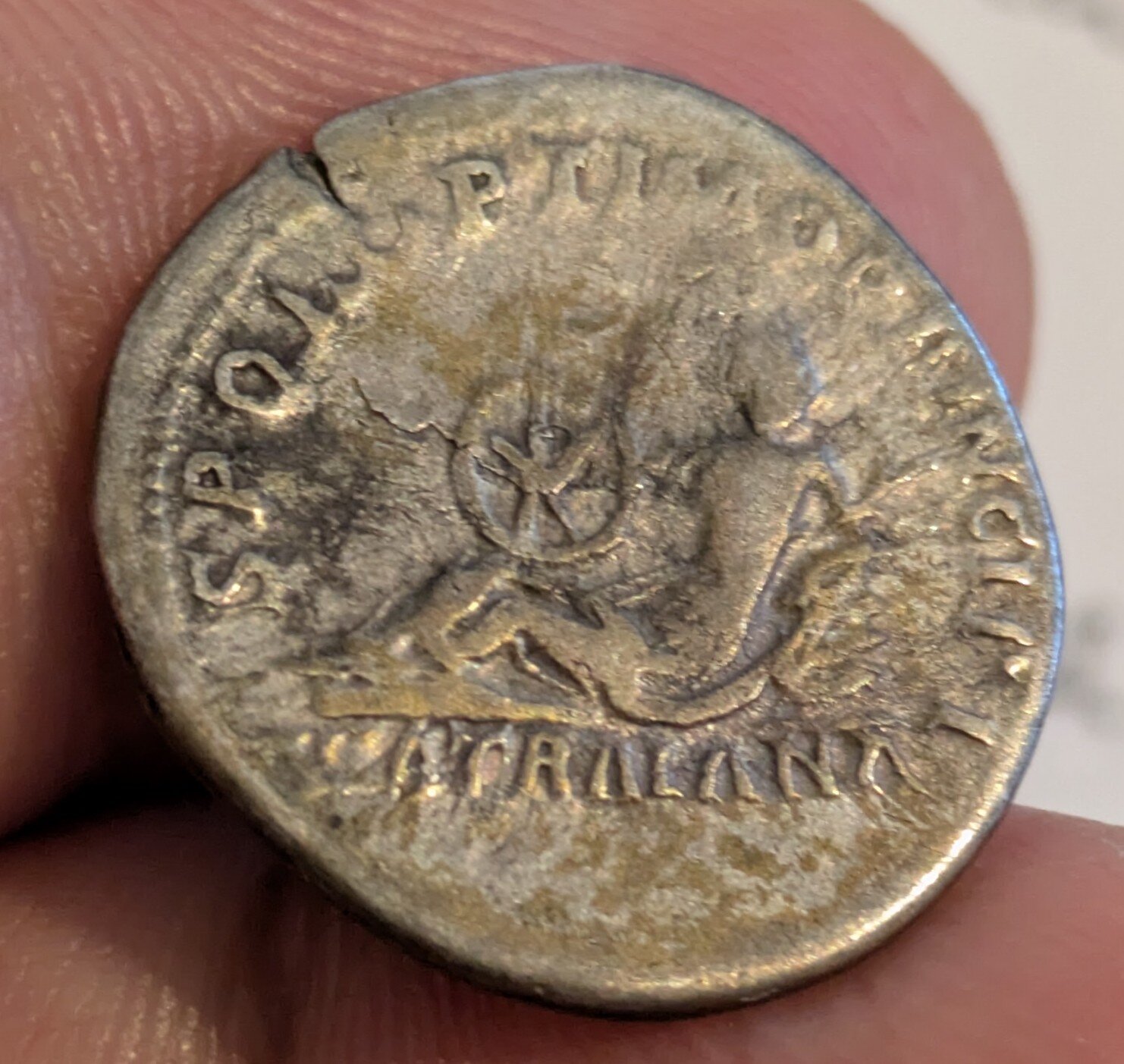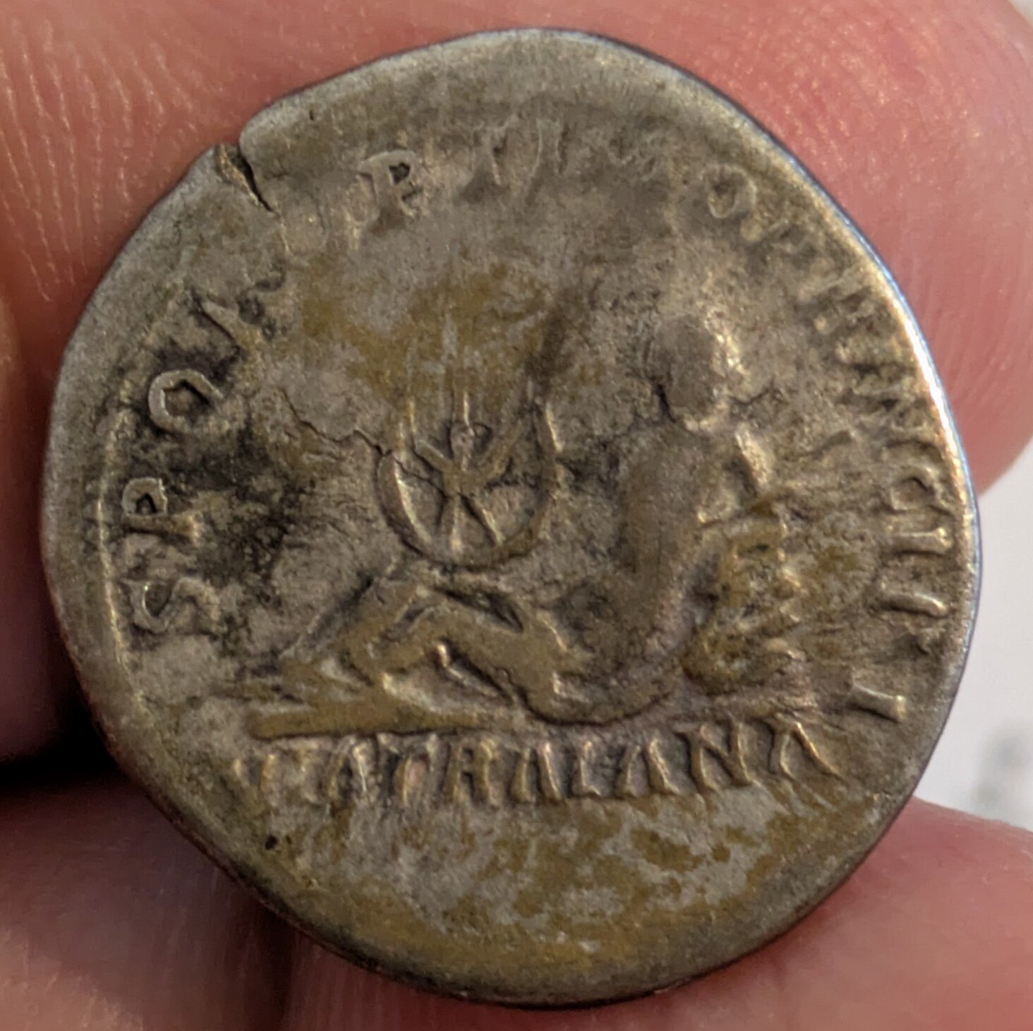 La moneta è usurata ma ha comunque dei buoni dettagli con legende quasi del tutto leggibili. Il rovescio, molto caratteristico, presenta una figura distesa che tiene uno scettro ed una grande ruota; in esergo la dicitura Via Traiana.