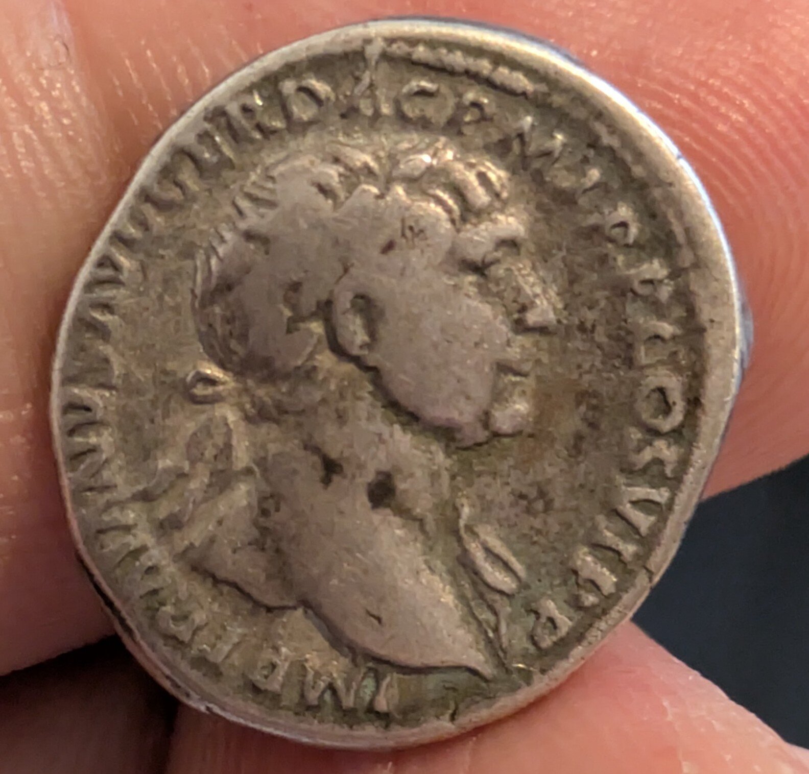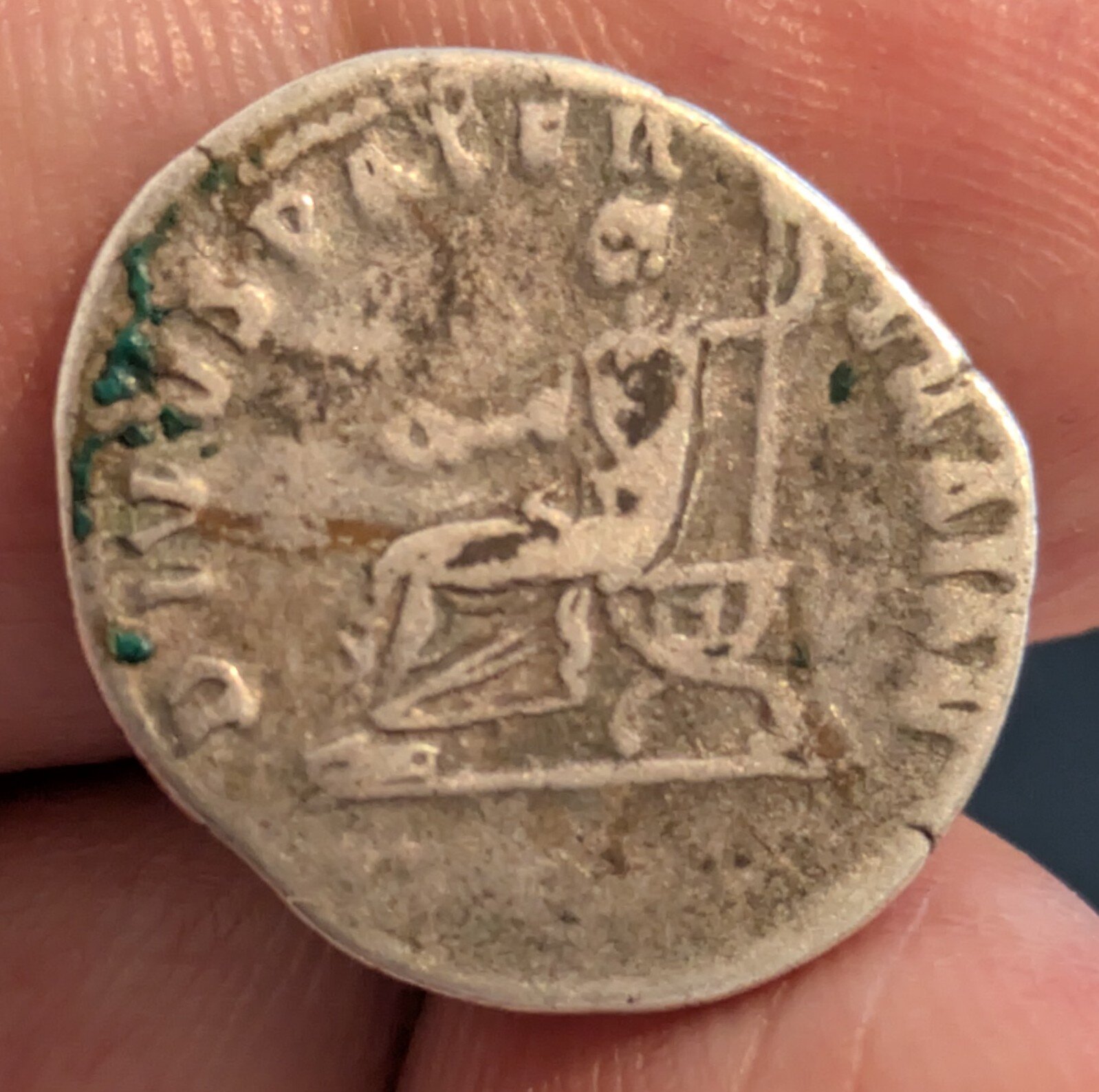 Un altro denario di Traiano, molto circolato, che commemora un evento molto importante, cioè la consacrazione del padre. Il senato approvò la richiesta e così fu battuto questa moneta a perenne memoria. Al rovescio il padre di Traiano siede su sedia curule rivolto a sinistra con patera e scettro; intorno la legenda Divus Pater Traian. Al dritto busto laureato con drappeggio sulla spalla sinistra (lontana). Dovrebbe essere il RIC 252 se non sbaglio.