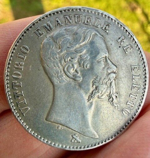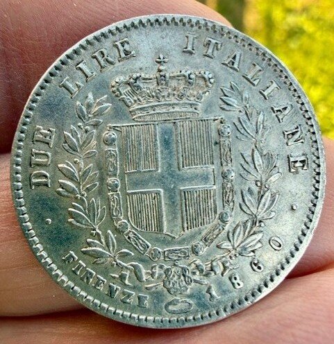 condivido questa moneta di Vittorio Emanuele II° da due lire italiane del 1860 - zecca di Firenze, aggiudicazione d'asta di poco tempo fa. La sua conservazione è modesta, ma per cortesia vorrei conoscere anche il vostro parere. In allegato le prime due foto sono quelle della casa d'asta. Grazie per l'attenzione.