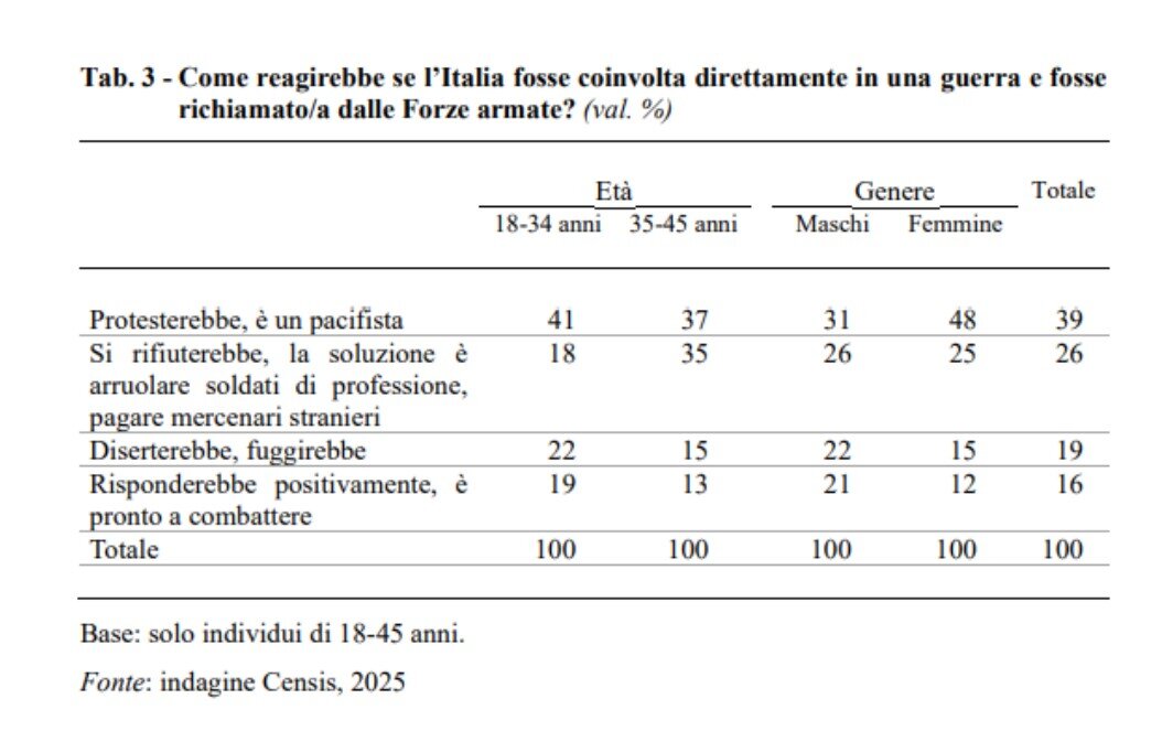interessato al dibattito sulla "leva volontaria", ho trovato pubblicato questo sondaggio del Censis, sulla capacità degli Italiani di affrontare un "richiamo alle armi". Questo è il risutato: