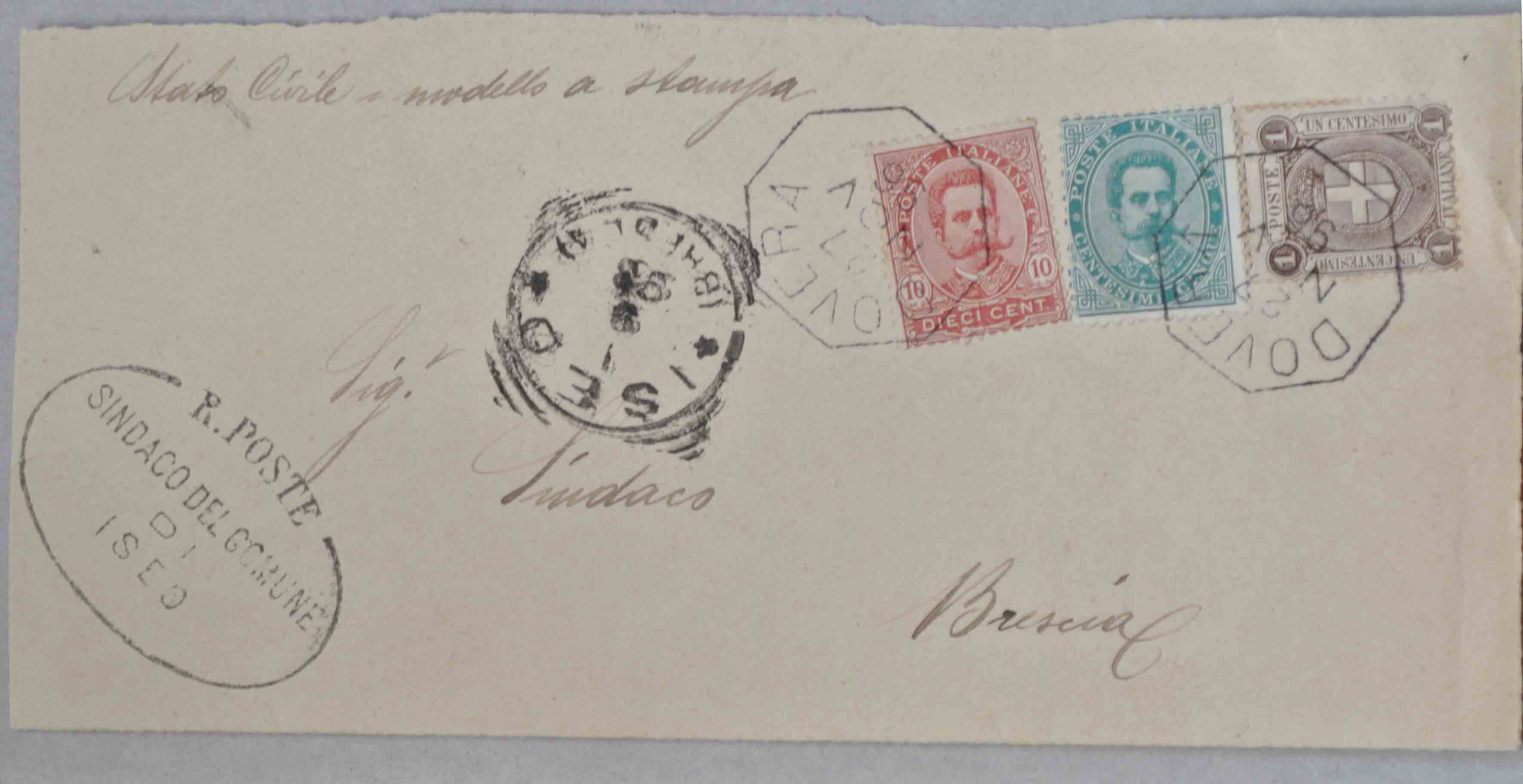 AngeloCF Inviato 1 ora fa Supporter #1 Inviato 1 ora fa Buongiorno ho trovato questo frammento di una busta di corrispondenza tra i sindaci di Iseo e Brescia, ma non riesco a capire l'affrancatura, se non sbaglio la tariffa ridotta dovrebbe essere di 10c. Purtroppo la busta è stata tagliata e ho solo questo frammento.