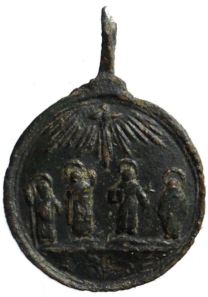 Sono S. Felice da Cantalice (con la bisaccia), S. Pio V (con stola e camauro), S. Andrea Avellino (Pianeta), S. Caterina da Bologna (con una croce in mano). Canonizzati da Clemente XI il 22/5/1712.-  In alto lo Spirito Santo sotto forma di colomba.- XVIII secolo.-