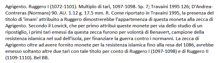 E' valutato R un interessante esemplare di multiplo di tarì, forse da zecca in Agrigento, per Ruggero I .