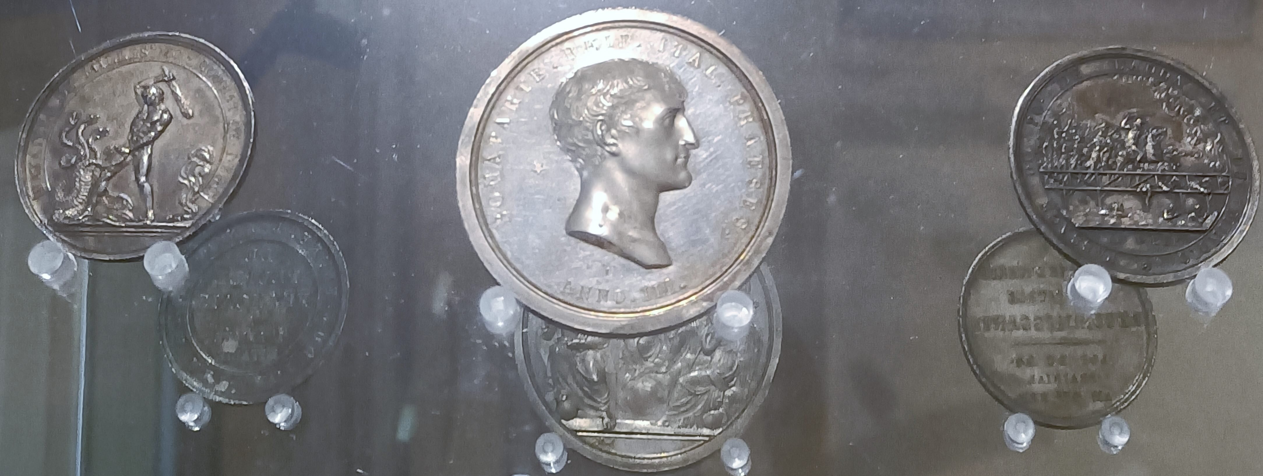 Ho fatto comunque un tentativo con quelle della campagna napoleonica e dintorni, l'unica che è discretamente leggibile è quella relativa alla "congiura di Pichegru" del 1804. Si intravvede parte del rovescio, nello specchio dietro alla moneta. La terza medaglia mi pare si riferisca alla battaglia di Lodi.