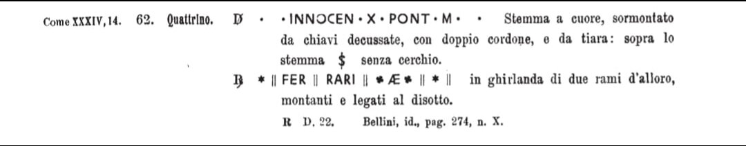Si tratta di un quattrino di Innocenzo X coniato a Ferrara con al dritto lo stemma cuoriforme del papa e al rovescio tra corona di alloro la legenda "Ferrariæ". Nonostante sia distrutta, tanto da avere una voragine nel tondello, che già di suo è ondulato e martoriato, la adoro ed è un inedito.