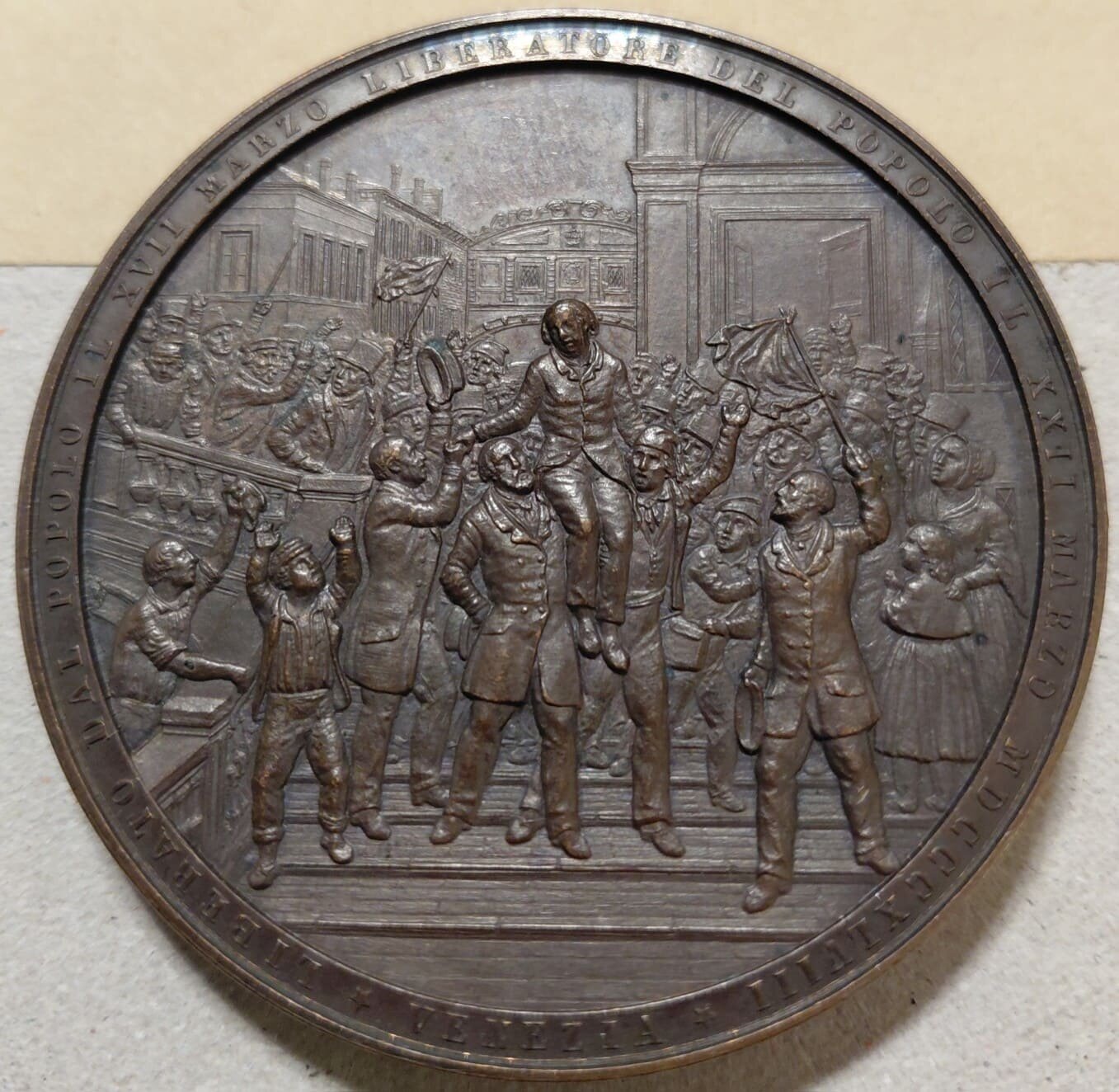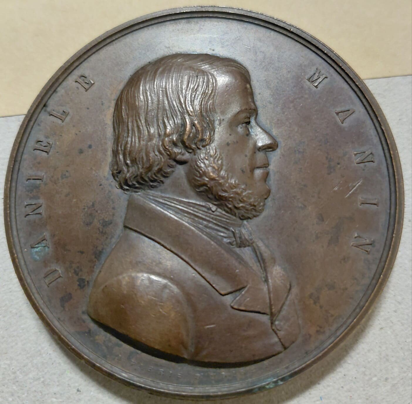 Buongiorno. Condivido questa medaglia in bronzo, che celebra la liberazione di Daniele Manin, che fu presidente della repubblica di Venezia nel 1848/49. Aggiungo alcuni frammenti trovati nel web.