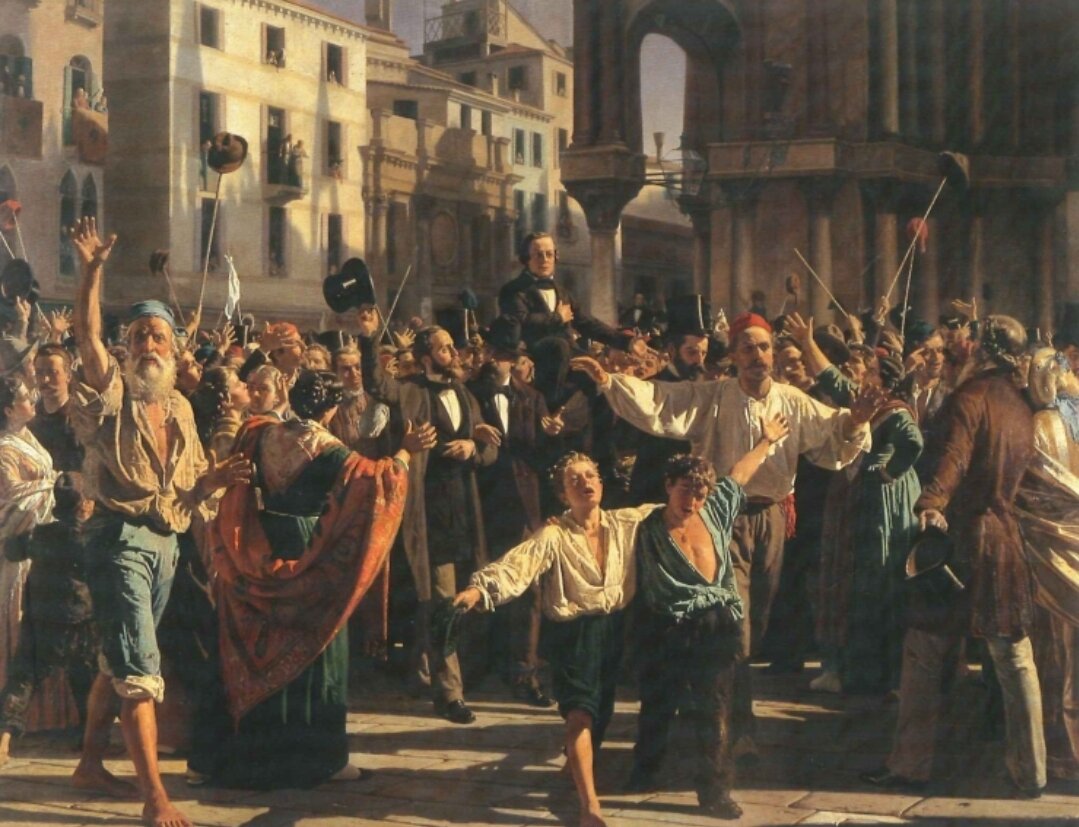 Aggiungo un dipinto di Napoleone Nani che altrettanto fotograficamente, racconta quei momenti. La scena non è la medesima della medaglia, ma temporalmente uno scorcio di poco successivo, e qui, alla destra di Manin, si può vedere Nicolò Tommaseo sventolare il cilindro. I due, accompagnati dalla folla, stanno entrando in Piazza San Marco.