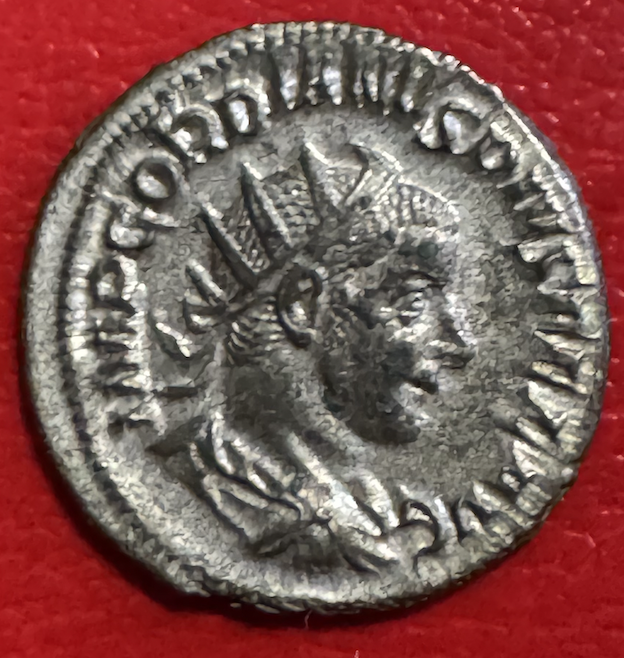 La seconda è un antoniniano di Gordiano III dedicato a Giove Statore (che ferma e tiene saldi). Fa riferimento alla leggenda secondo cui i Romani di Romolo, in ritirata dopo la battaglia contro i Sabini (dopo il noto Ratto delle Sabine), furono sostenuti da Giove invocato da Romolo stesso e riuscirono a resistere bloccando l’avanzata nemica.