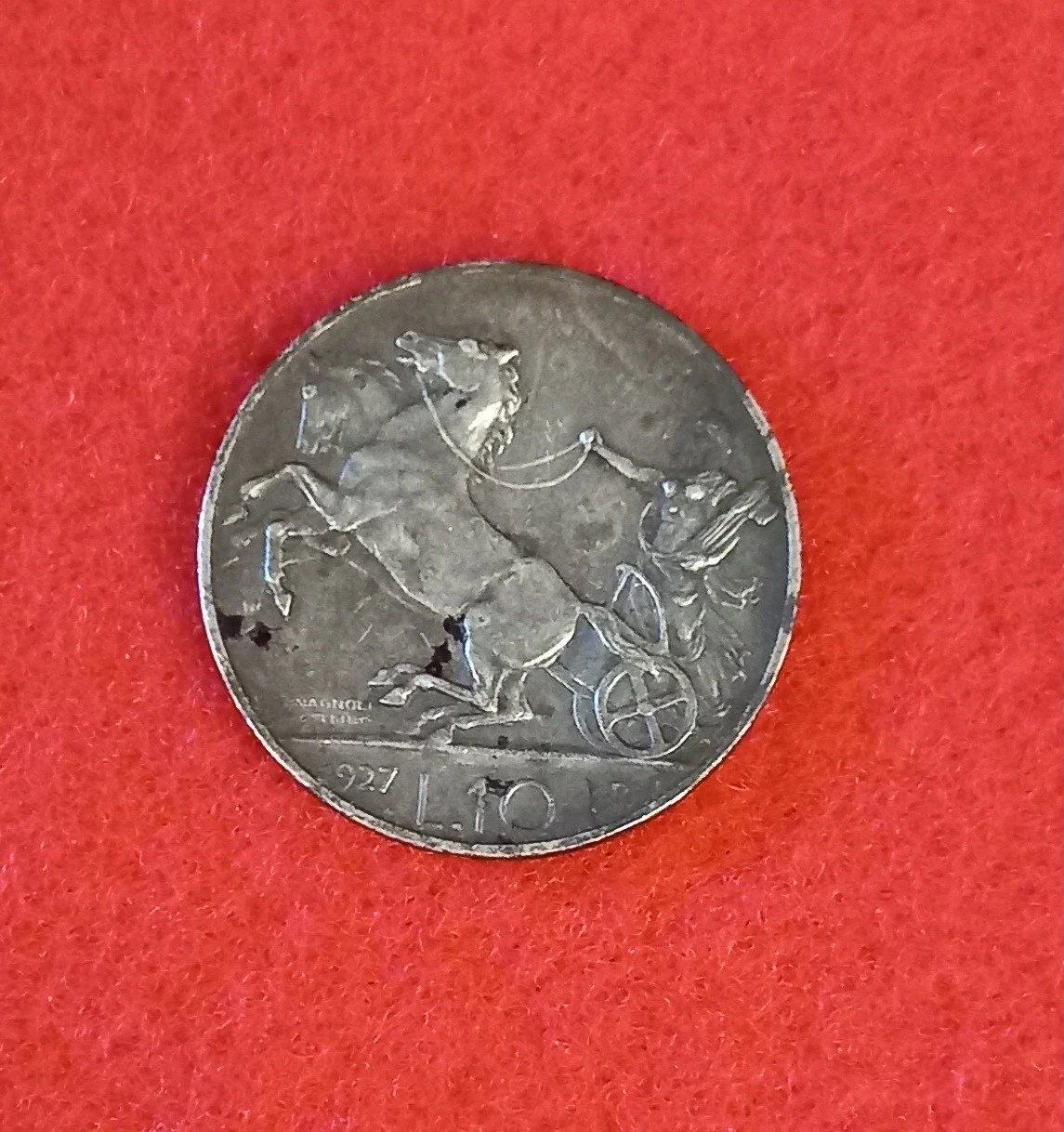 Mah, non darei per scontato che è autentica, il due della data non mi piace, il colore, che dovrebbe essere argento, non mi sembra abbia assunto una patina consona all'argento. Non capisco se le macchie nere che si vedono, sono macchie o buchi (sembrano buchi) più verso il cancro dell'alluminio che non dell'argento. Boh, bisogrebbe vederla in mano.