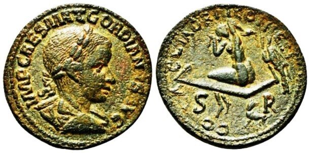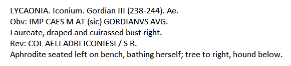E' valutato " extremely rare " un esemplare in AE da Iconio nella Licaonia per Gordiano III, con al diritto busto dell' imperatore ed al rovescio figurazione di Afrodite, seduta di spalle su panca  .