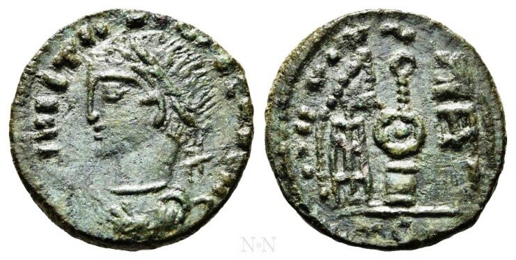 E' presentato da " Uncertain germanic tribes " un interessante esemplare in AE imitativo di tipi costantinei, con al diritto busto laureato e corazzato ed al rovescio figure ai lati di scudo su altare .
