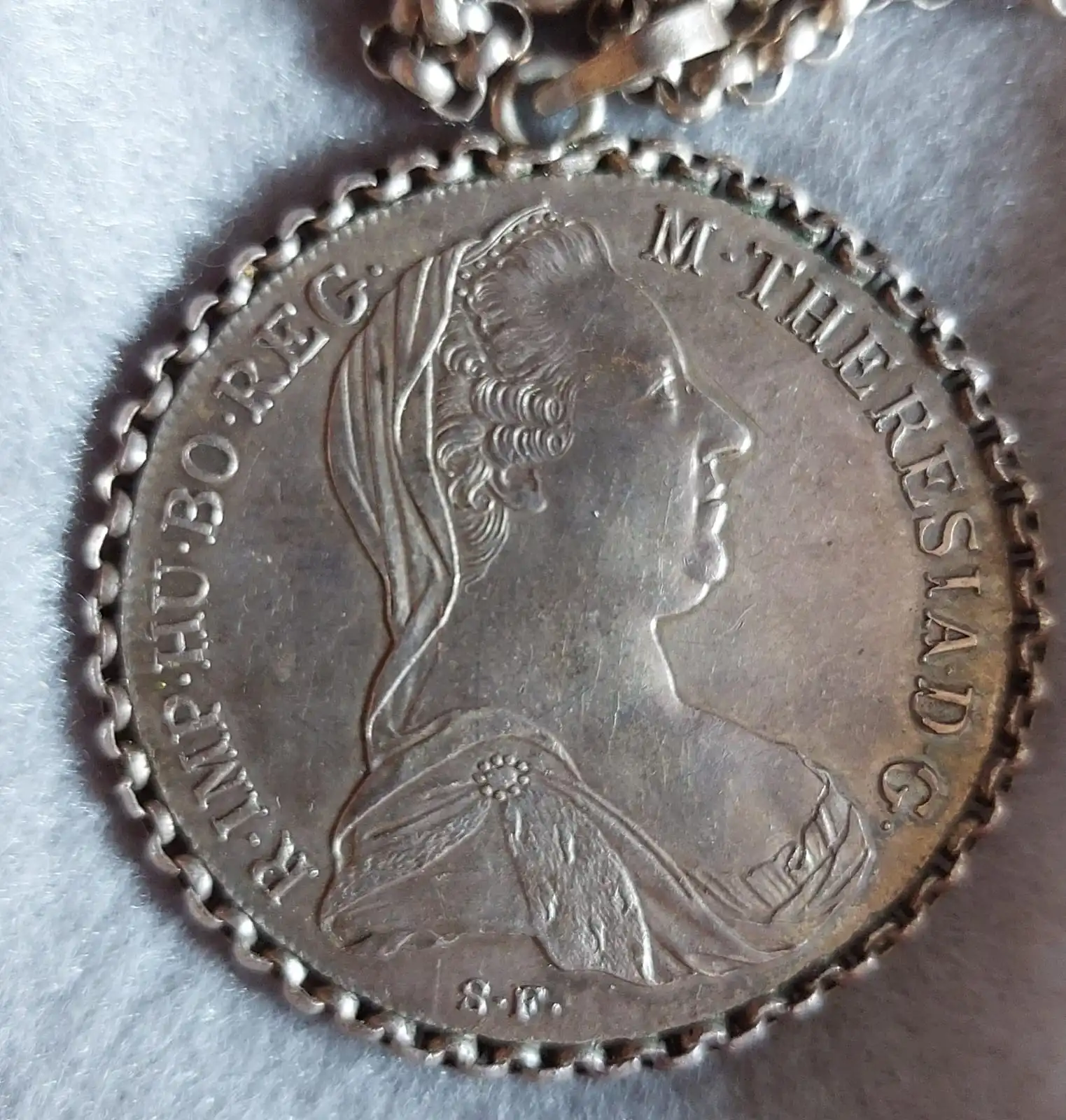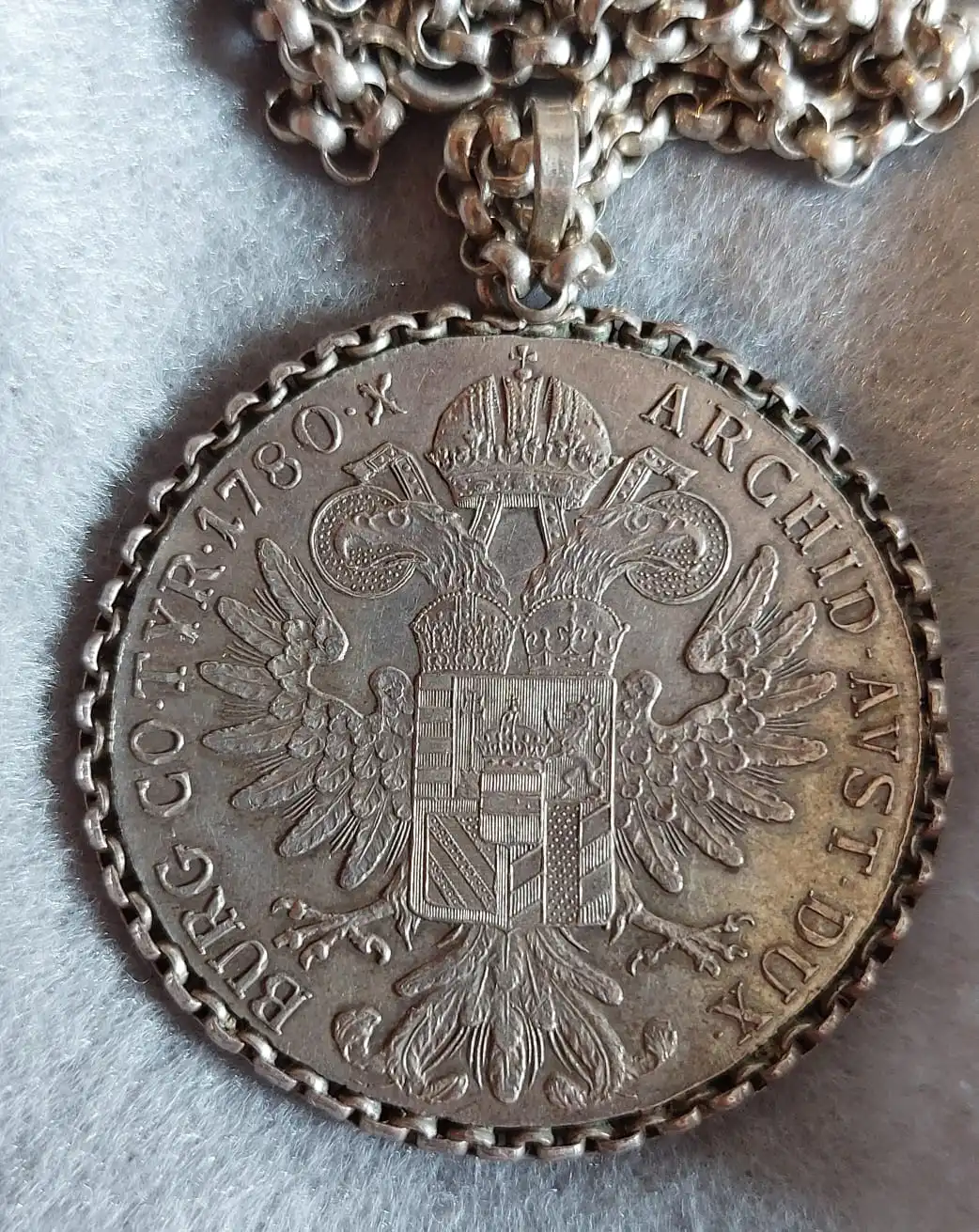 Una coppia di amici austriaci mi ha regalato un tallero di Maria Teresa del 1780 (ho difficoltà a distinguerlo dal 1/2 tallero, ma dal diametro che ho misurato, circa 41 mm, dovrebbe essere 1 tallero). Purtroppo, come si vede in foto, la moneta è stata incorniciata e resa collana (non da loro, credo dai loro nonni / genitori).