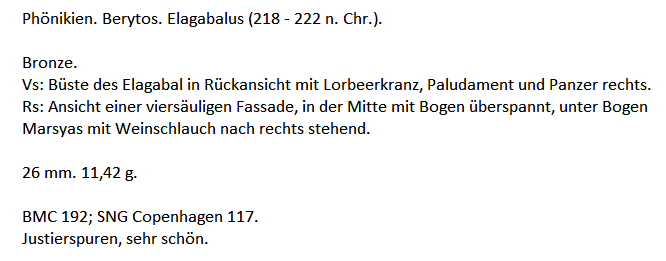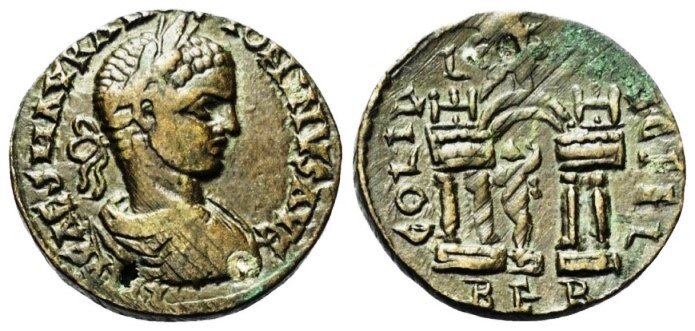 Da Berytos nella Fenicia, un esemplare in AE per Eliogabalo con al diritto suo busto ed al rovescio vista di edificio tetrastilo con figura all' interno .