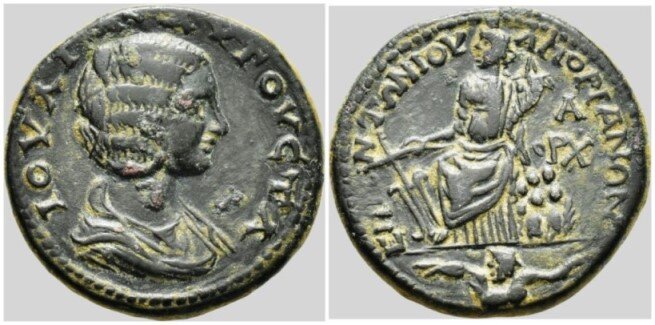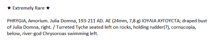 Da Amorio nella Frigia, un " Extremely Rare " esemplare in AE per Julia Domna, con al diritto busto dell' augusta ed al rovescio Tyche seduta su rocche .