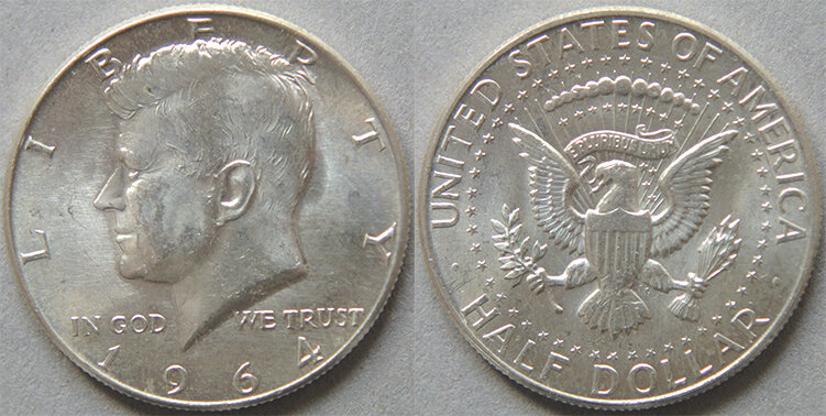 Altra moneta che mi è capitata tra le mani è questo mezzo dollaro del 1964, peso 15.59g e diametro 30.7mm, anche di questa mi piacerebbe conoscere la storia