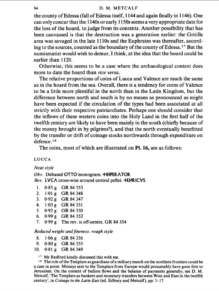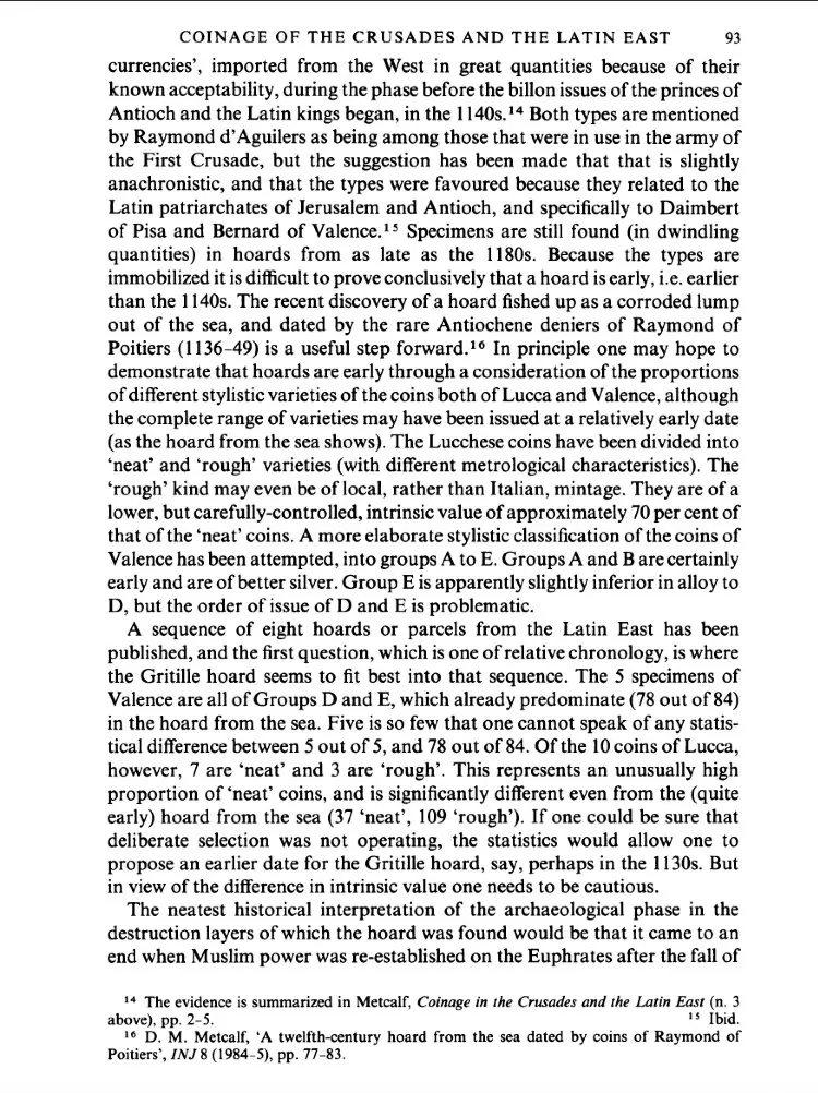 Ulpianensis Inviato 18 ore fa #9 Inviato 18 ore fa Purtroppo ancora non mi consta… È un periodo che sono sopra proprio alcune monetazioni feudali del Midi francese, e nonostante grandi soddisfazioni con alcune sorprese, purtroppo per Valence non mi sono ancora imbattuto in nulla di interessante… se lo scopro, ti faccio sapere. Considerando un approccio che però mi aveva dato almeno qualche dato su Melgueil, andando a vedere il poco che si trova pubblicato con immagini riguardanti ripostigli, mi sembra che la tipologia sia davvero quella per oltre un secolo: spesso trovo nelle aste la datazione “XIII secolo”, ma se si guardano a ripostigli di XII secolo la tipologia è quella: Cita