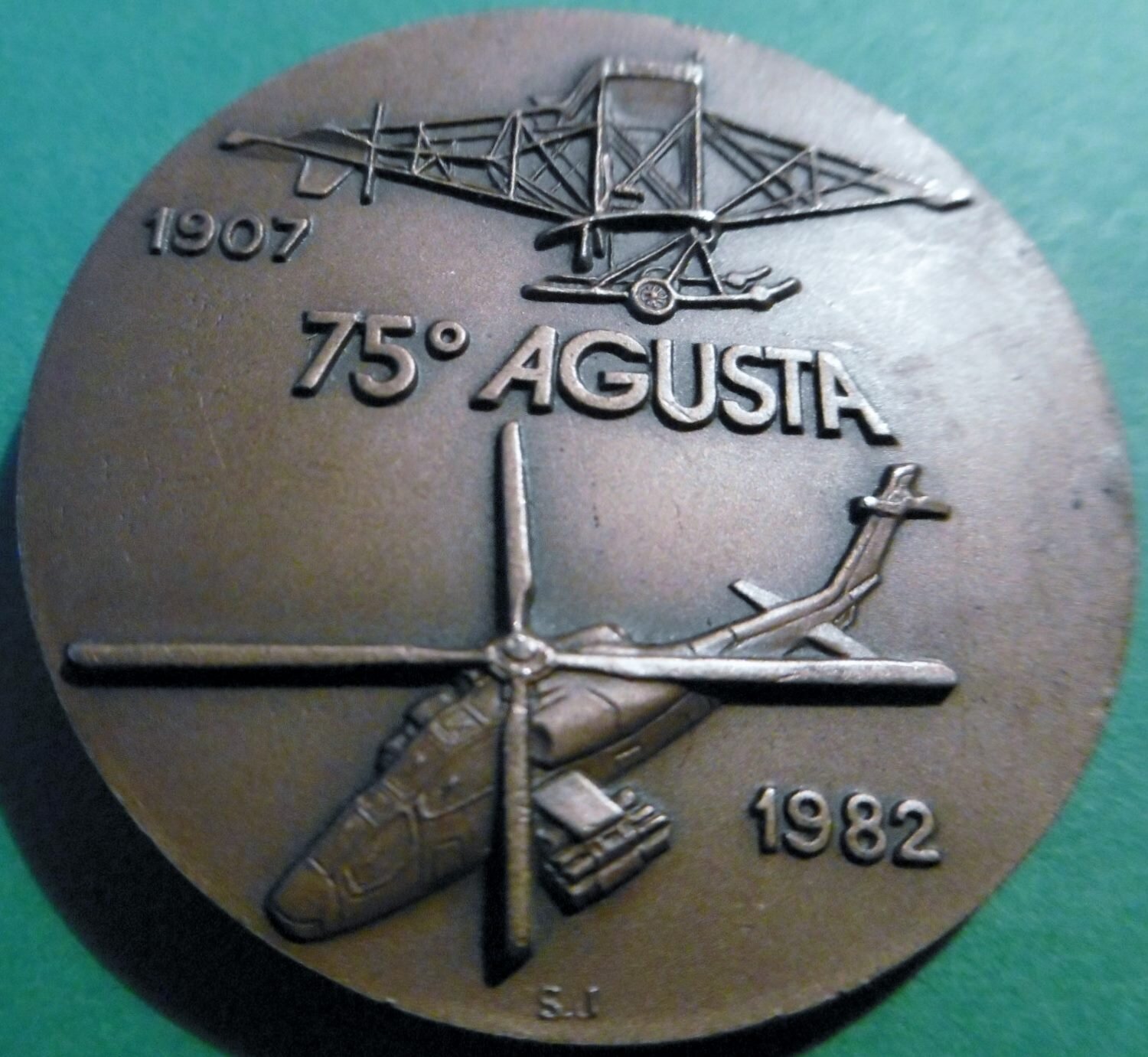 gpittini Inviato 1 ora fa #1 Inviato 1 ora fa DE GREGE EPICURI Medaglia di 35 mm e 18,14 g., in rame. Al D il busto frontale, e la scritta GIOVANNI AGUSTA. Al R., un prototipo antico di aereo; sotto, un elicottero. Scritte: 1907/1982, 75° AGUSTA. In basso la sigla della Johnson: SJ. Cita