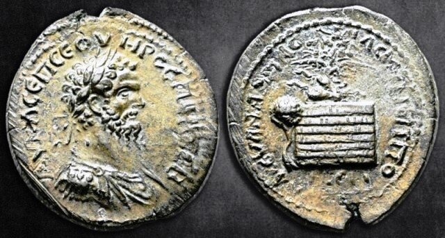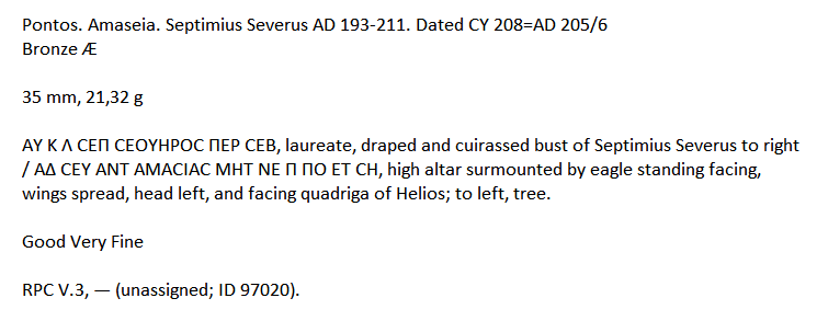 VALTERI Inviato 1 ora fa #1 Inviato 1 ora fa Da Amasea nel Ponto, un vistoso esemplare in AE per Settimio Severo, con al diritto suo busto laureato ed al rovescio altare accostato dal albero e sormontato da aquila e quadriga del Sole . Sarà a giorni, il 22 Febbraio, in vendita Savoca 309 al n. 128 . Cita