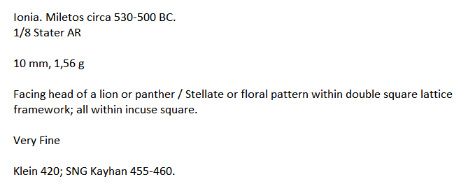 VALTERI Inviato 1 ora fa #1 Inviato 1 ora fa Da Mileto nella Ionia, un attraente esemplare di alta epoca, da 1/8s di statere, con al diritto testa frontale di leone ed al rovescio disegno ornato in quadrato incuso . Sarà il 22 Febbraio in vendita Savoca 309 al n. 72 . Cita