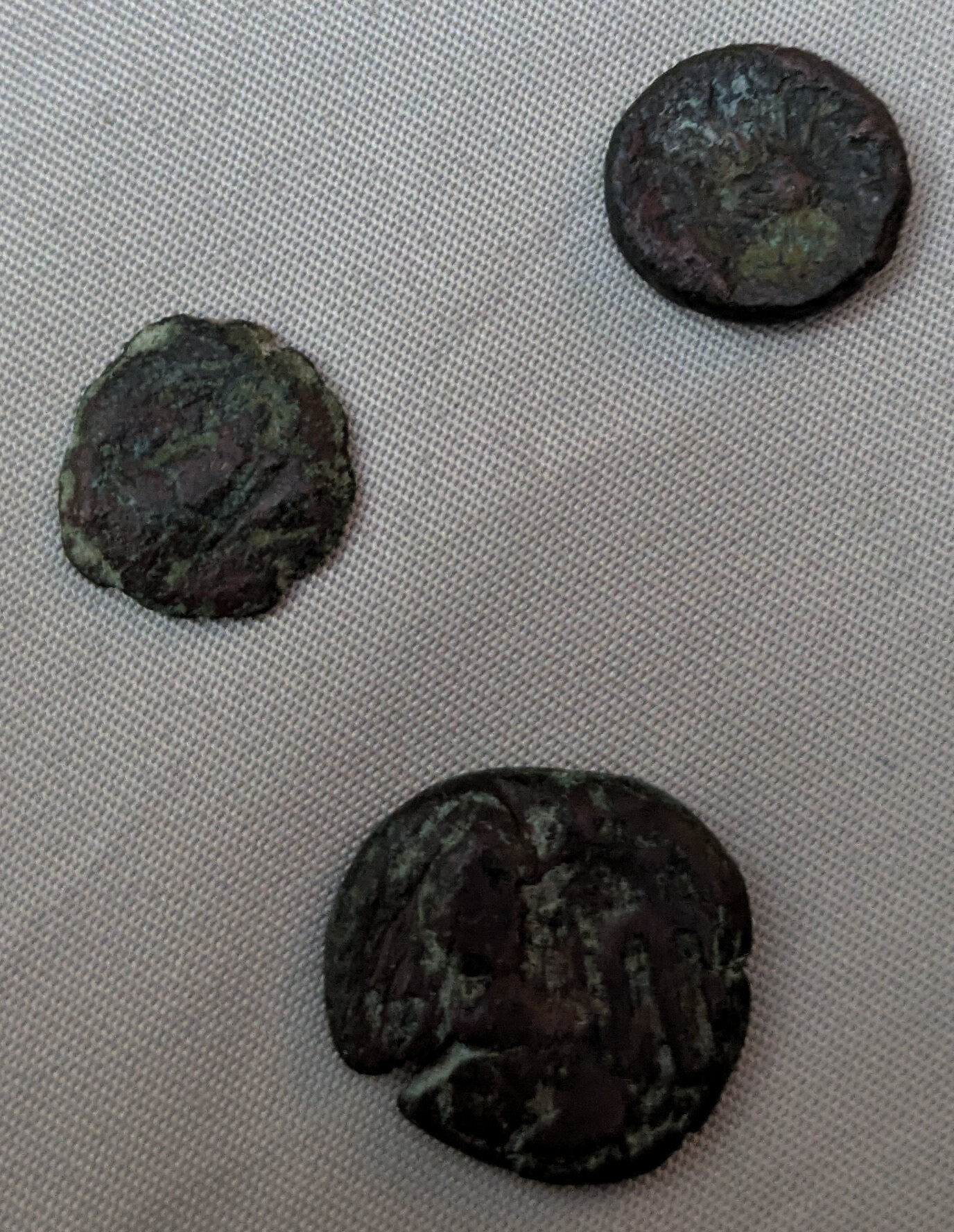 un visitatore del nostro circolo ci ha chiesto lumi su queste tre monetine. Non è assolutamente il mio campo e non sono certamente leggibilissime. Per di piú il fotografo (ovvero io) è abbastanza scarso. Chiedo lumi ai maghi della sezione.