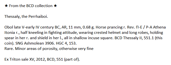 VALTERI Inviato 1 ora fa #1 Inviato 1 ora fa Dai Perraiboi di Tessaglia, un "rare" esemplare di obolo ancora di alta epoca, con al diritto cavallo scalpitante ed al rovescio figura in ginocchio di Atena in armi, entro quadrato incuso . Sarà il 28 Febbraio in vendita NAC February sale 2026 al n. 228 . Cita