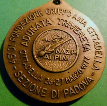 gpittini Inviato 1 ora fa #1 Inviato 1 ora fa DE GREGE EPICURI Una medaglia alpina (33 mm. e 13,74 g.). Al D. torre fra le mura, una piccola chiesa e cappello degli alpini. R: al centro, Associazione Nazionale Alpini. Nel giro esterno: 45° di fondazione gruppo ANA Cittadella, sezione di Padova. Nel giro interno: Adunata triveneta- Cittadella, 26-27 marzo 1977. Cita